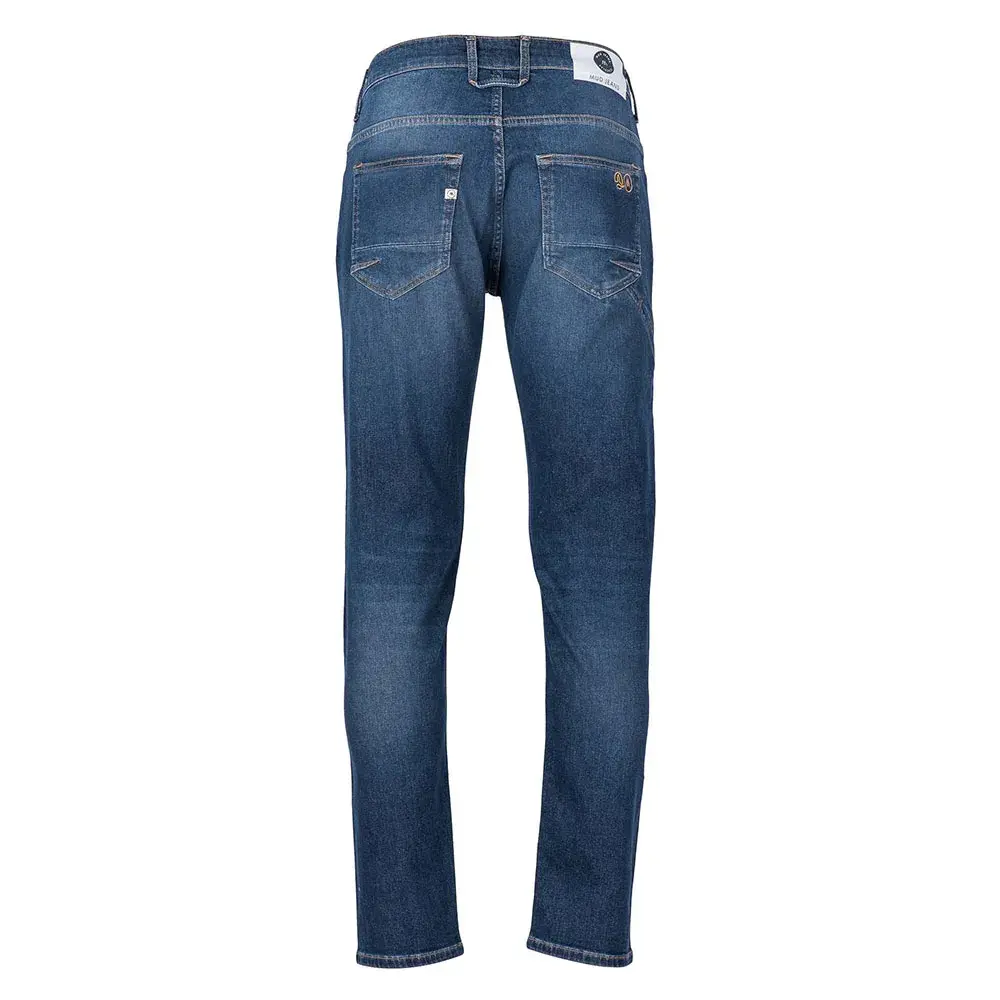 - Эти синие джинсы в основном подвергаются лазерной стирке, что придает им естественный потертый вид.
