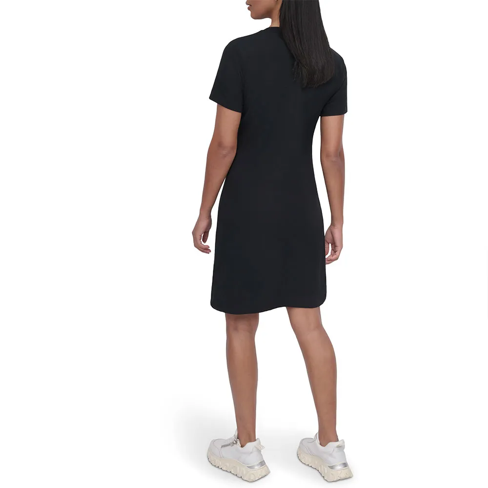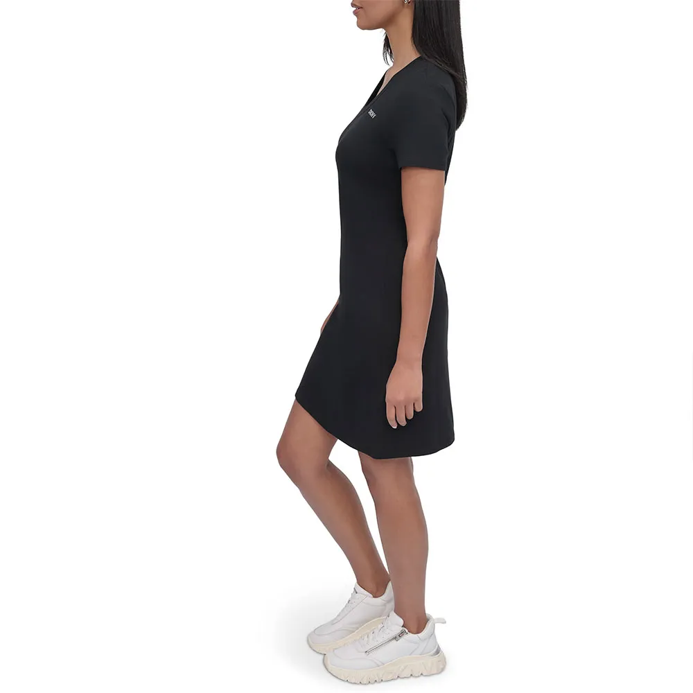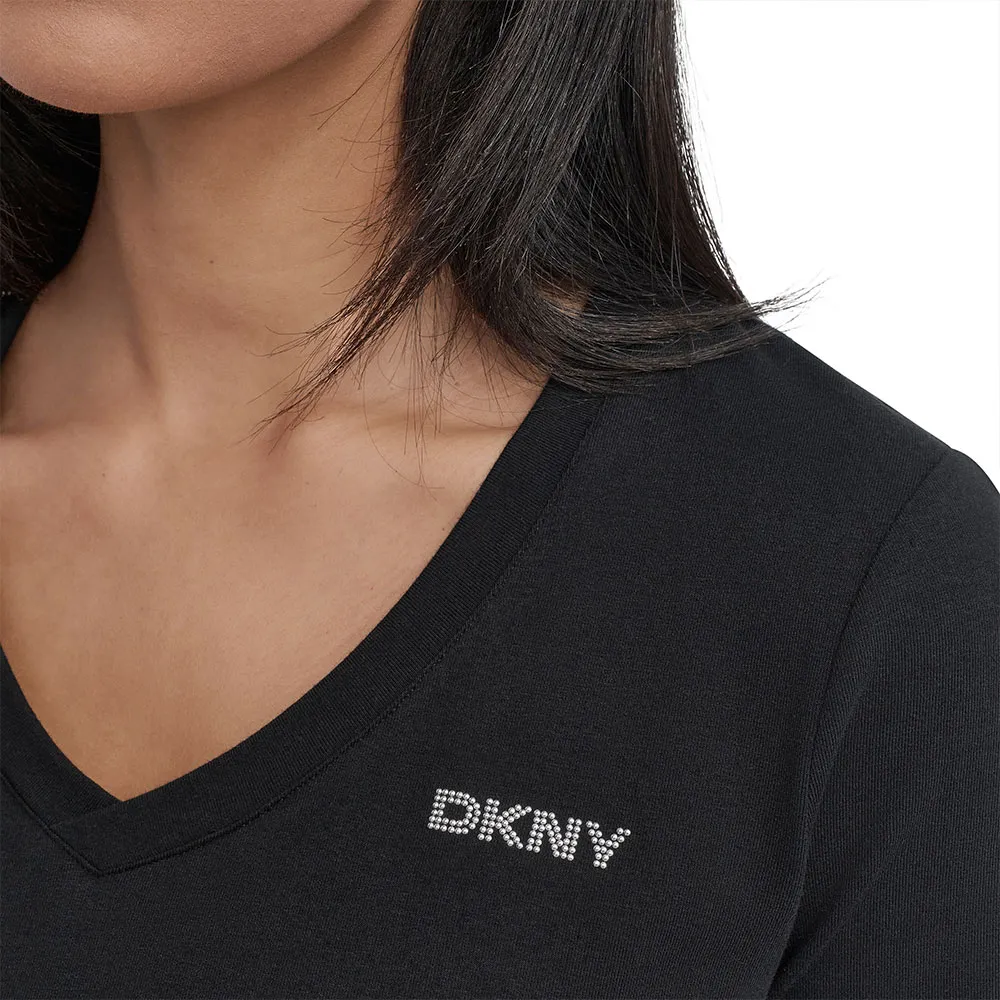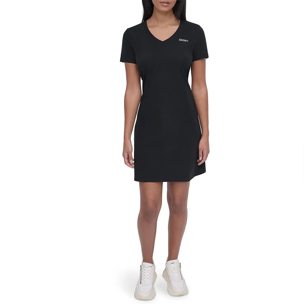 Мини-платье-футболка с V-образным вырезом и короткими рукавами, украшенное логотипом и заклепками.