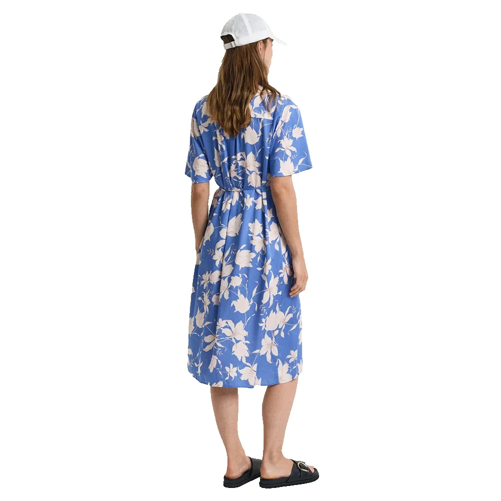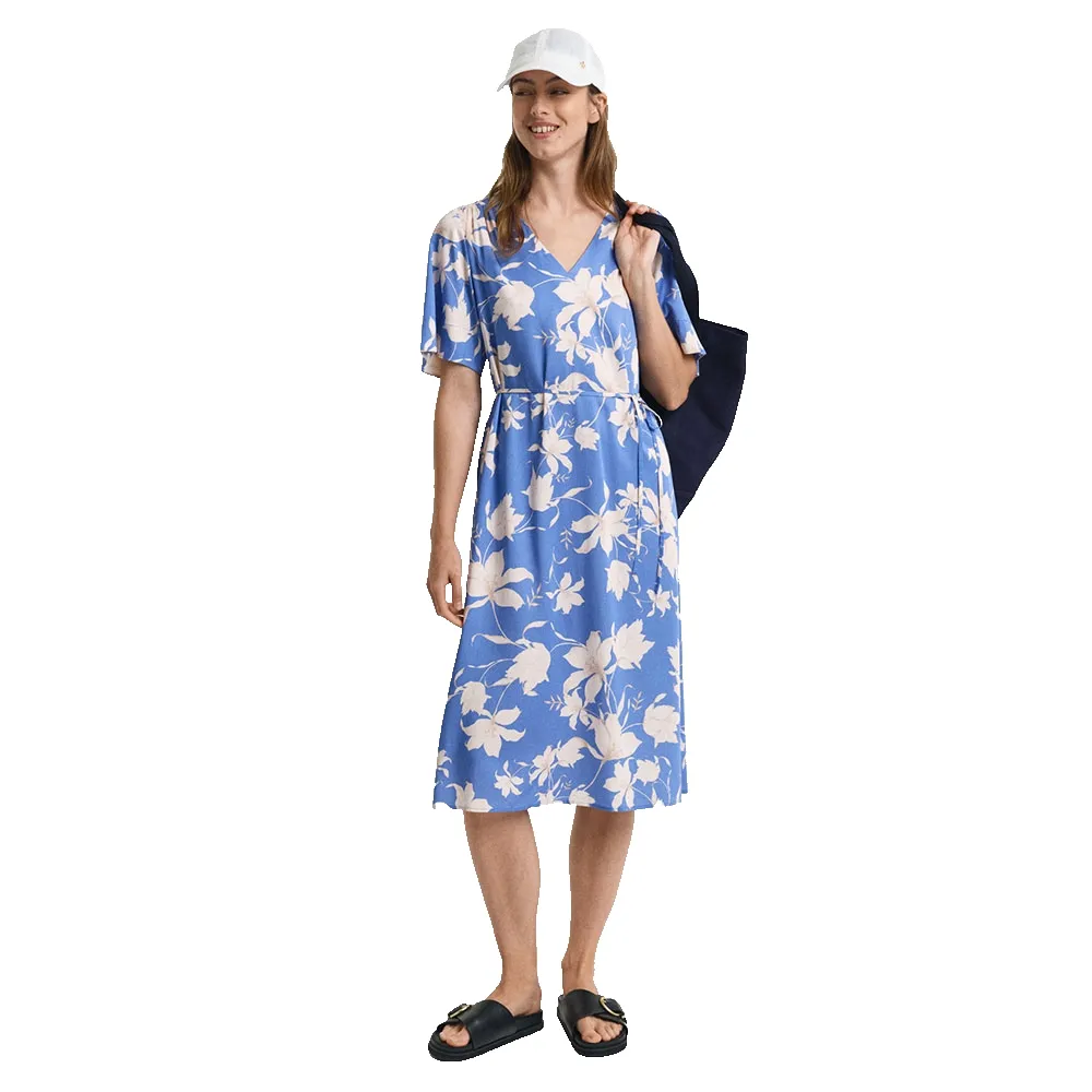 Это платье GANT из мягкой смеси вискозы и лиоцелла украшено нежным цветочным принтом, создающим ощущение текучести и элегантной драпировки.