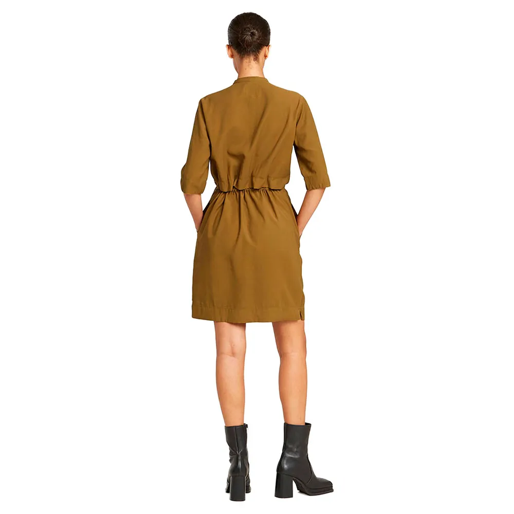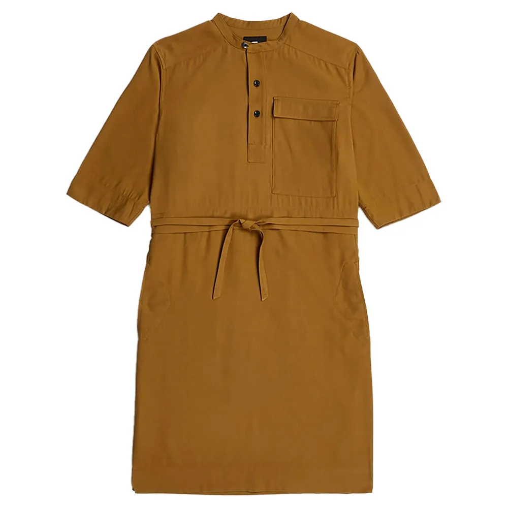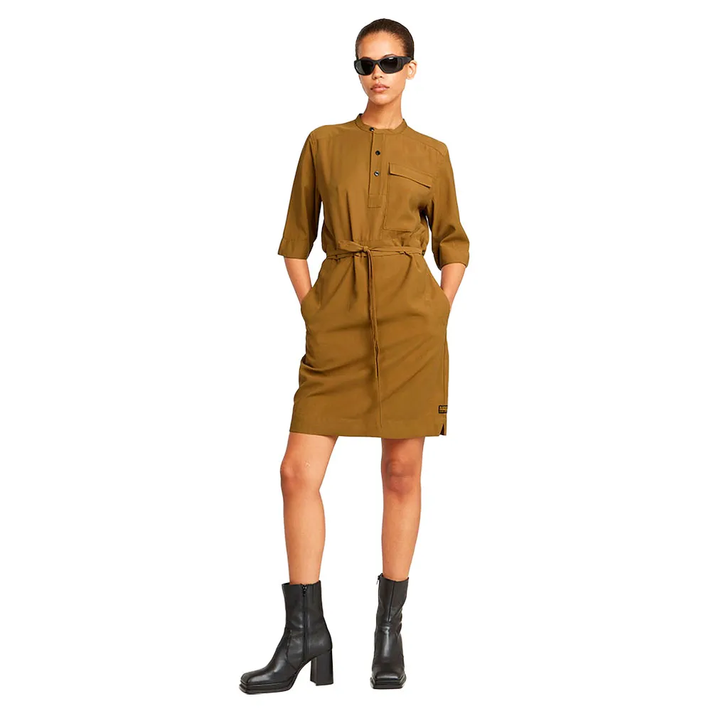 Платье Fluid длиной до колена имеет воротник-стойку с планкой.