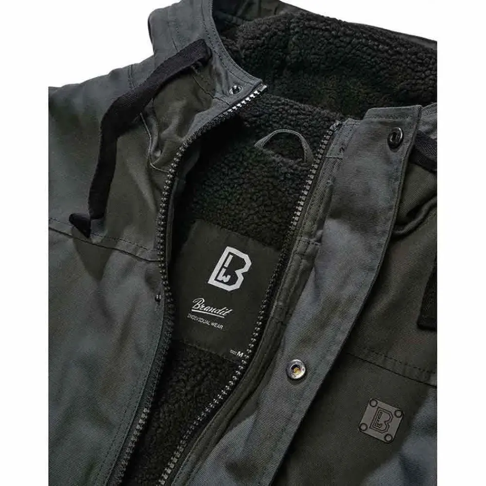 Короткая куртка с манжетами / Капюшон со шнурком / 2 прорезных кармана по бокам с застежкой на кнопку / Внутренний карман / Застежка-молния спереди с планкой на кнопку / Тисненый логотип на груди / Прочный холщовый наружный материал / Мех Тедди.