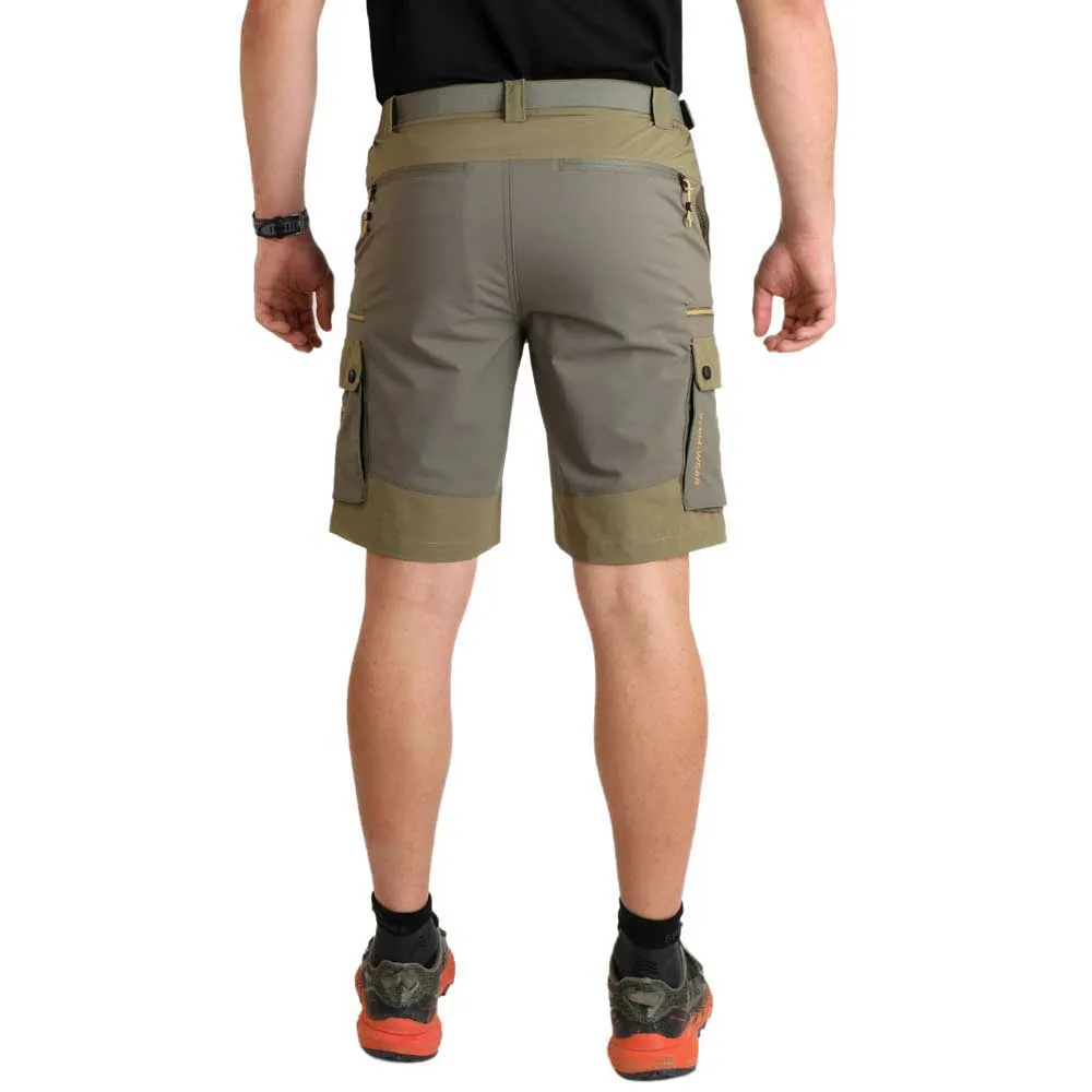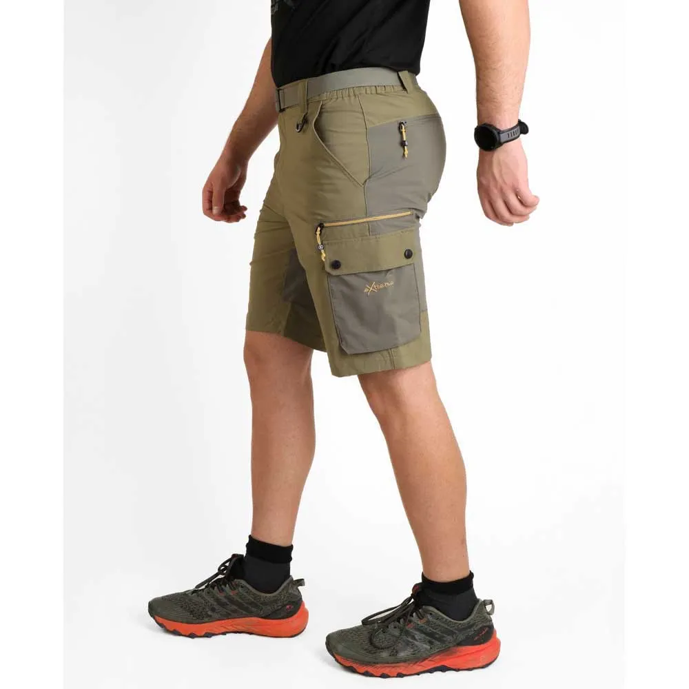 Полуэластичный пояс с застежкой на кнопках, регулируемый эластичный пояс, восемь карманов (четыре с обратными молниями, боковые карманы в стиле «карго» на кнопках и передние карманы во французском стиле), вышитый логотип.