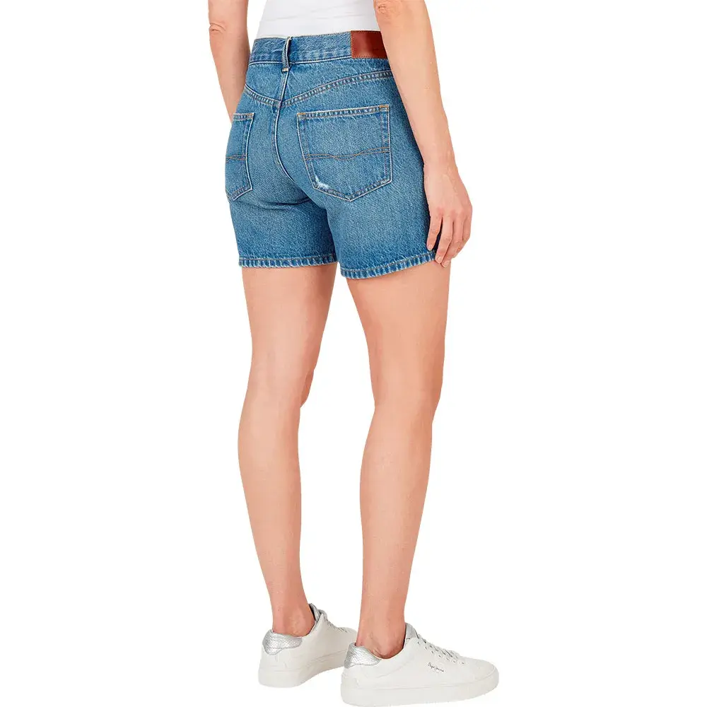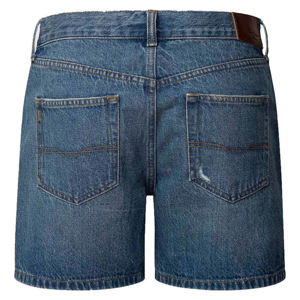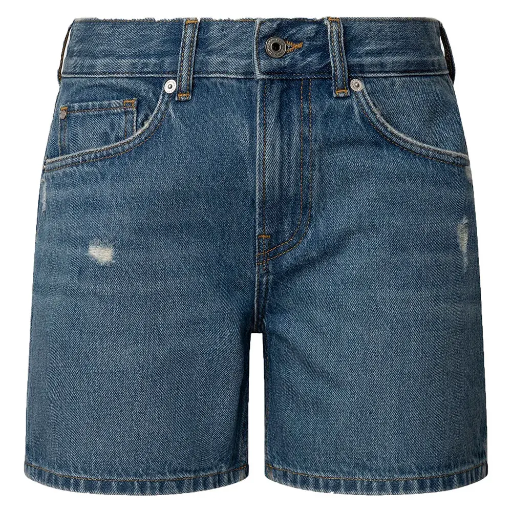 Шорты прямого кроя с высокой талией, пятью карманами и подвернутым нижним краем. Изготовлены из плотного денима средне-синего цвета с мелкими потертостями.