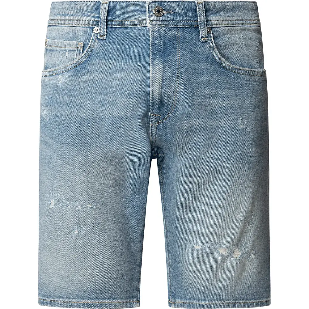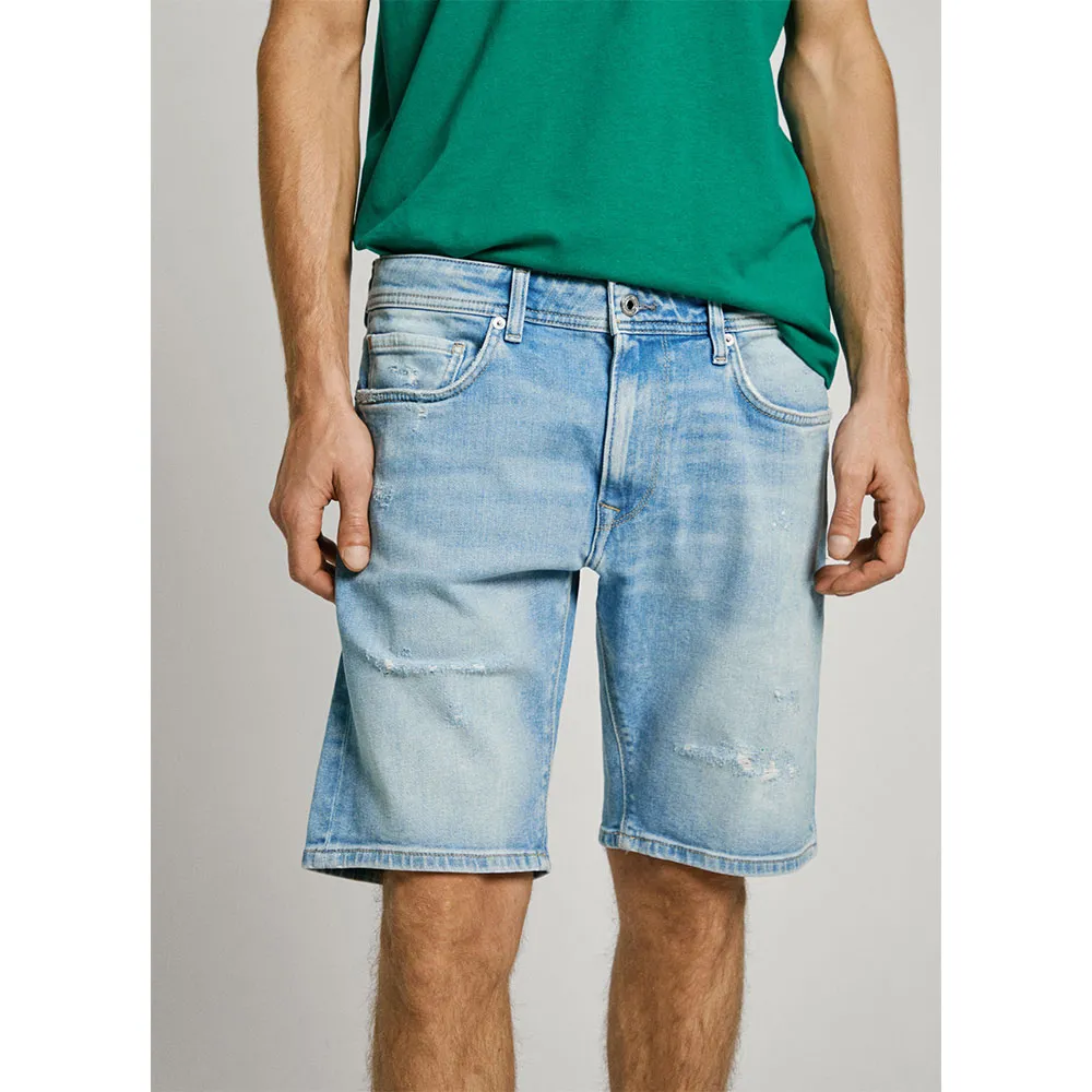 Классические зауженные шорты с 5 карманами будут предложены из светло-голубого эластичного денима с потертостями и разрывами для эффекта потертости.