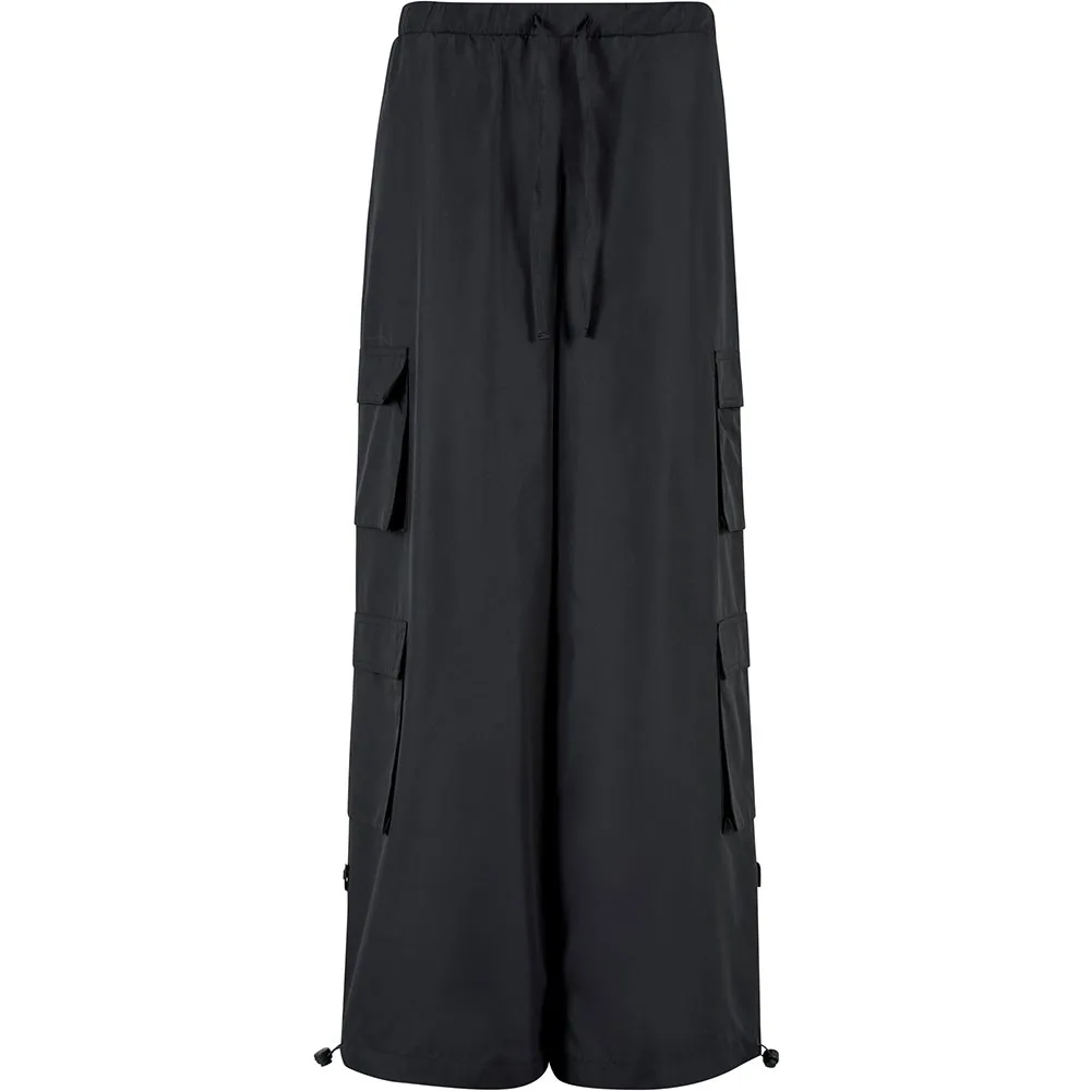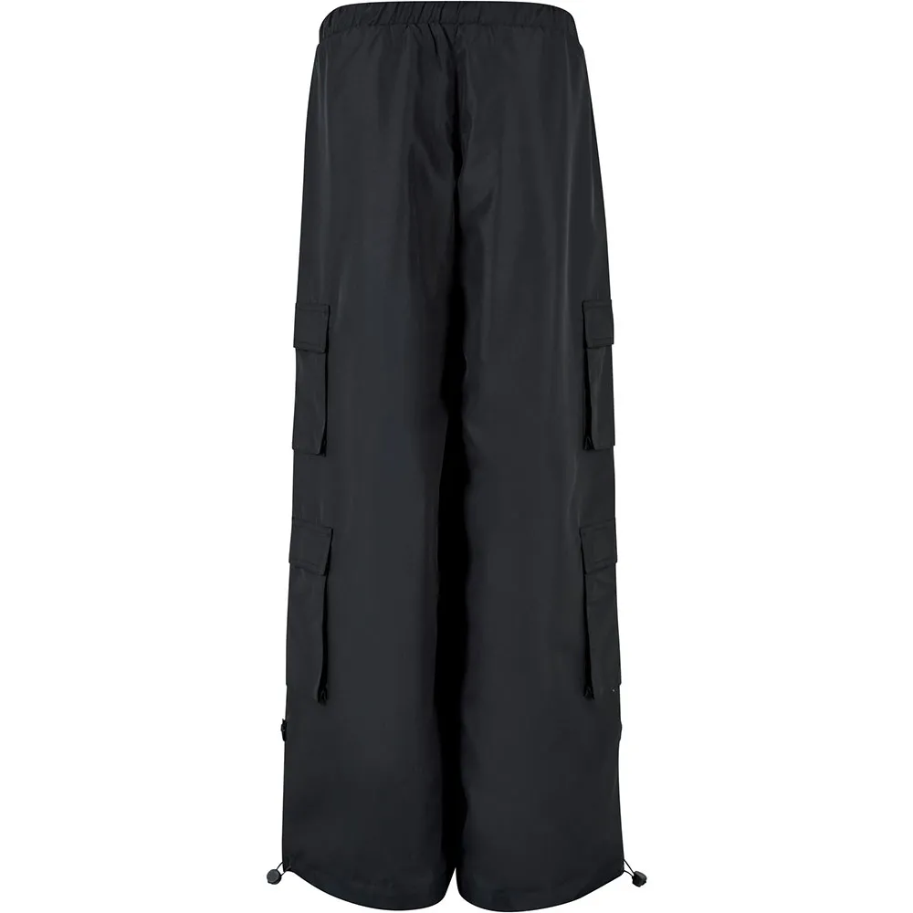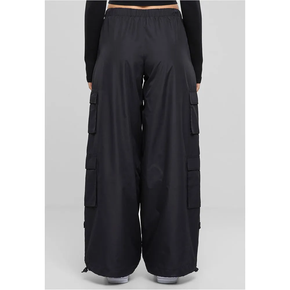 Женские брюки в модном стиле «парашют» выглядят особенно эффектно благодаря широким штанинам и четырем карманам-карго. Они изготовлены из лёгкого полиэстера рипстоп, а свободный крой подчёркивается свободным кроем. Талия регулируется шнурком. Эластичные шнурки со фиксаторами также корректируют брючины, обеспечивая посадку брюк по фигуре, напоминающую воздушный шар. Шнурок застегивается на кнопку, чтобы не волочился по полу.