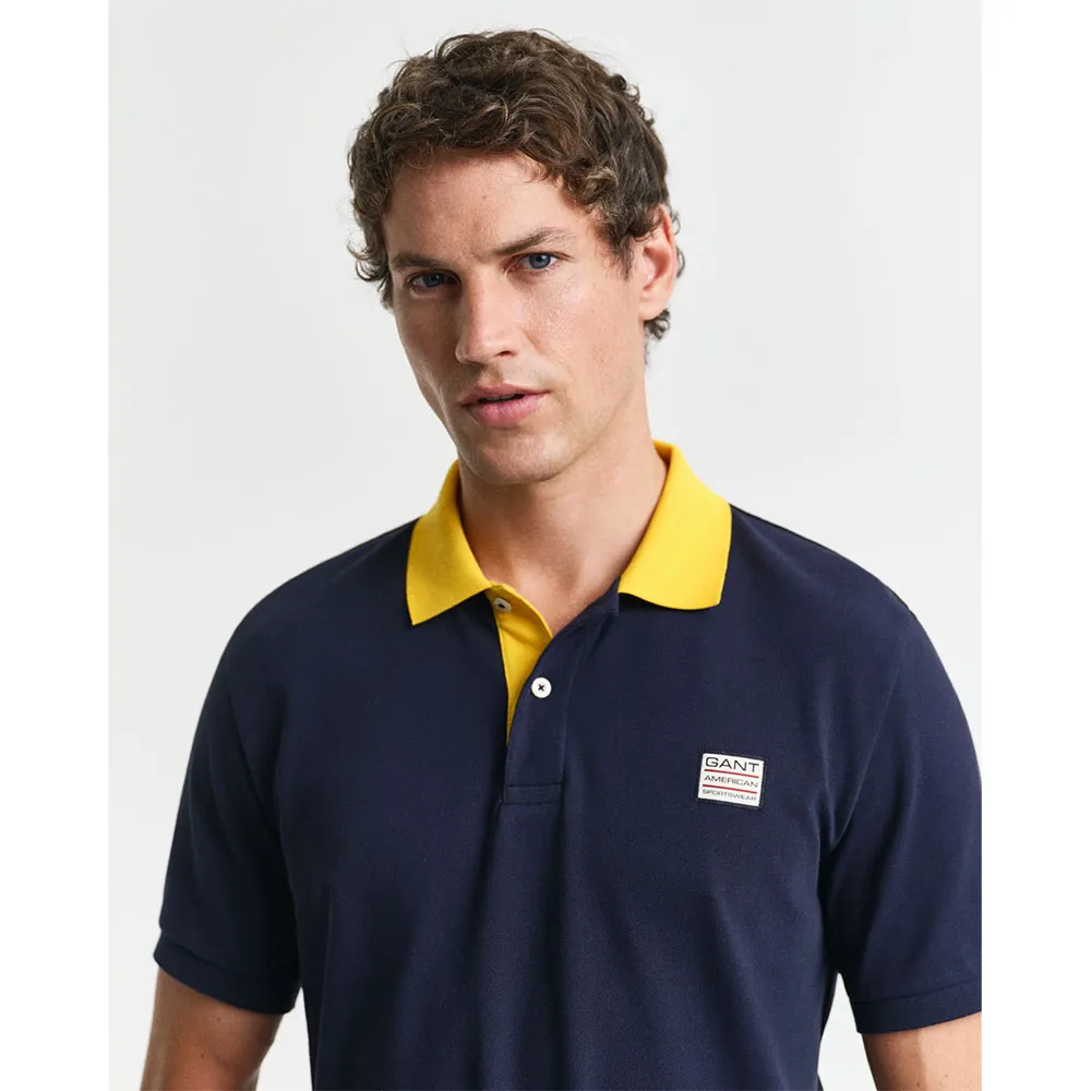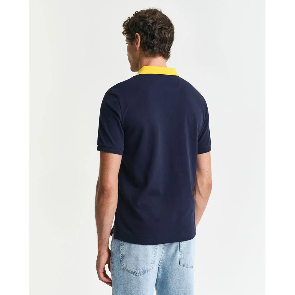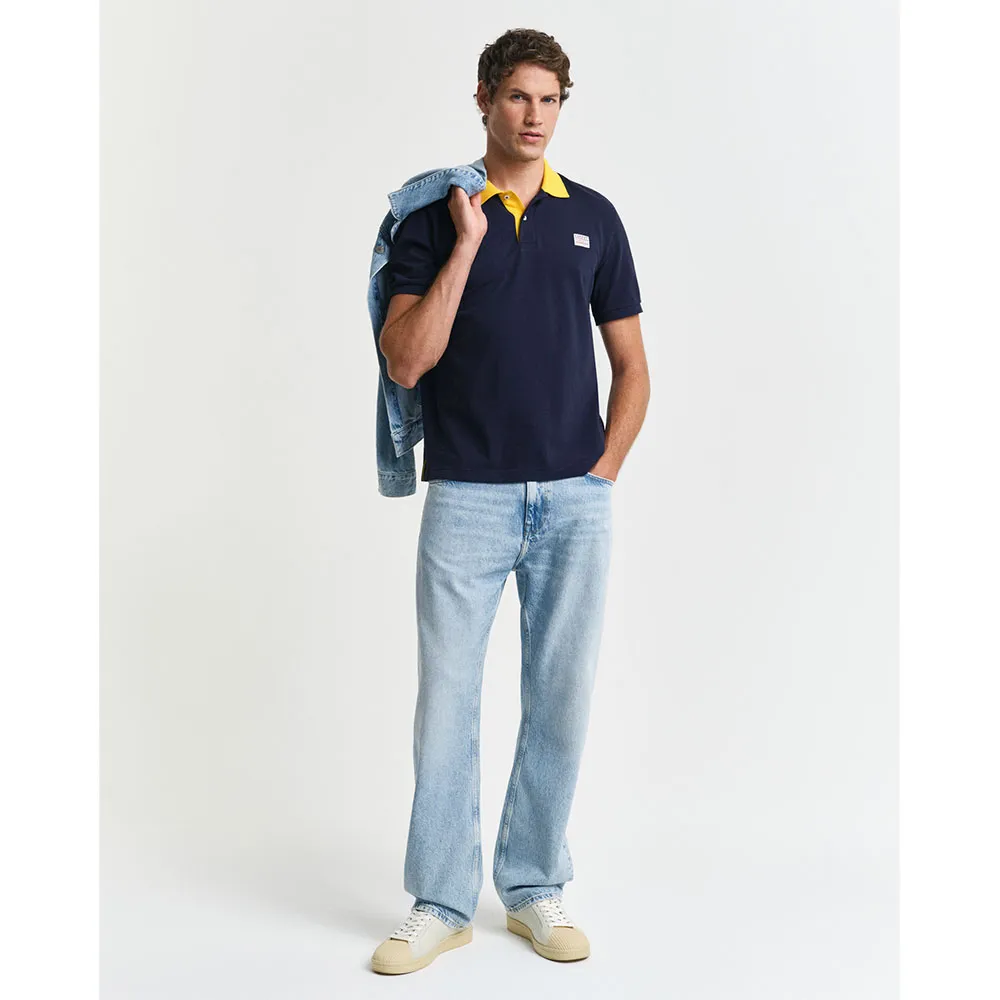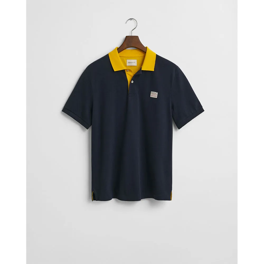 На груди расположена тканая этикетка GANT, а воротник, разрезы по бокам, подкладка на горловине, лента на горловине и нижняя часть планки имеют контрастные акценты.