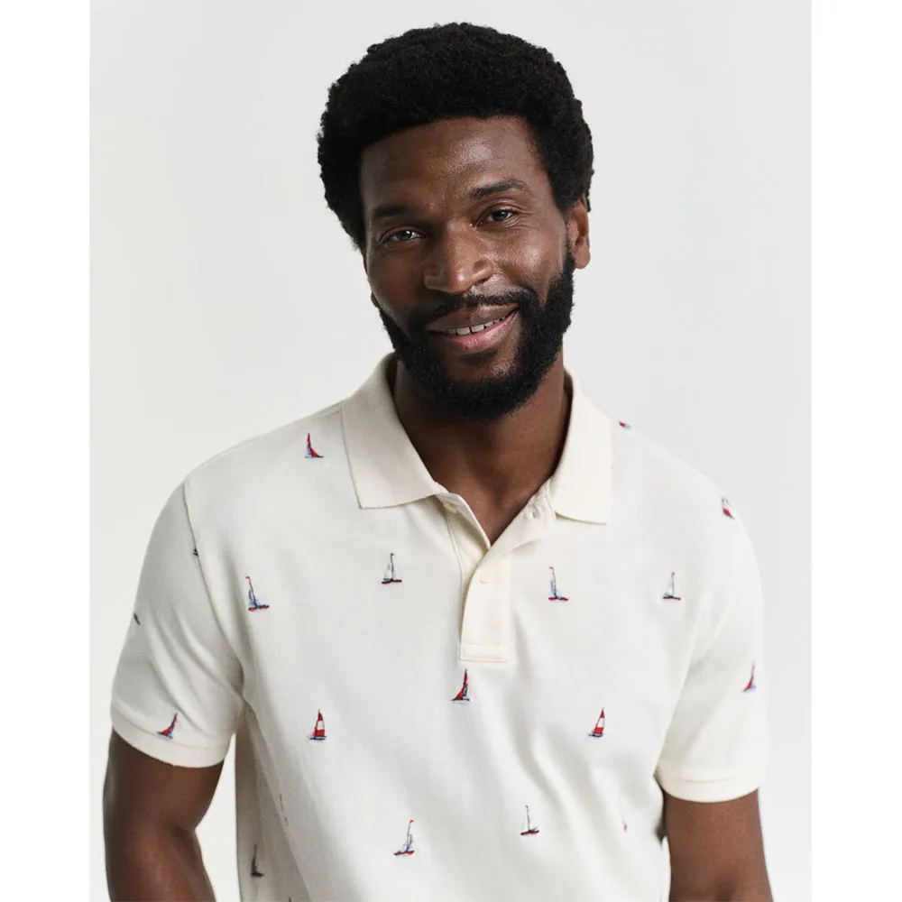Эта рубашка-поло из 100% хлопка добавит морскую нотку в ваш гардероб благодаря вышитому по всей поверхности графическому изображению лодки.