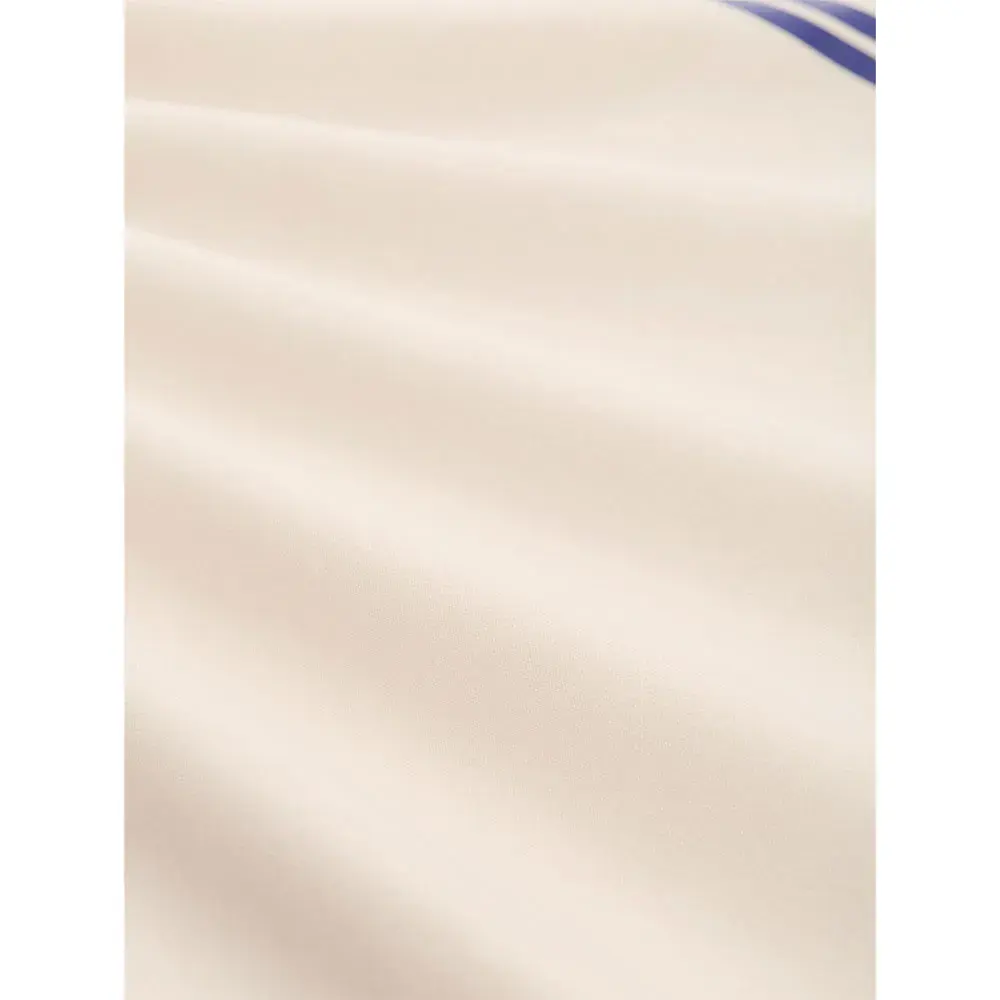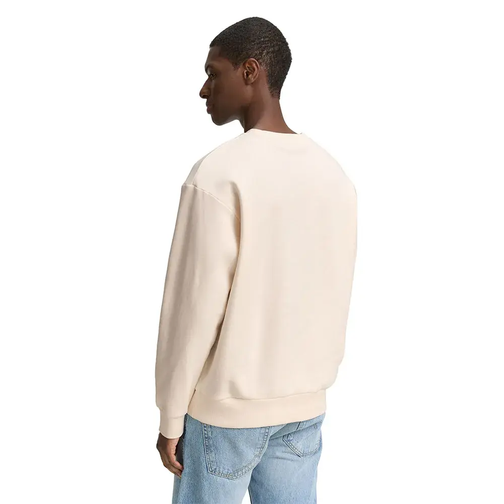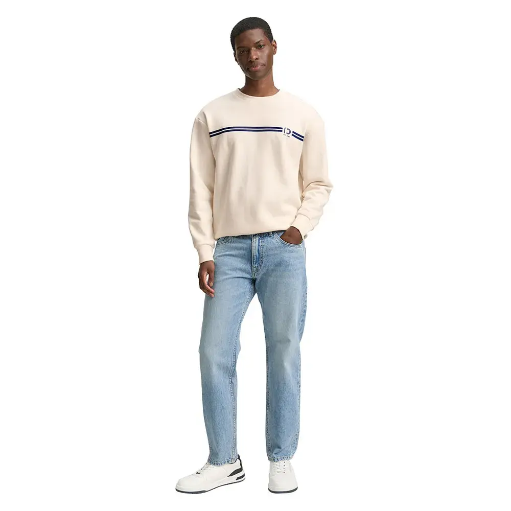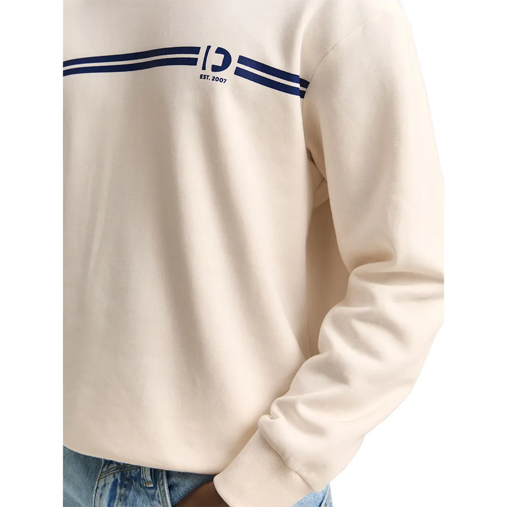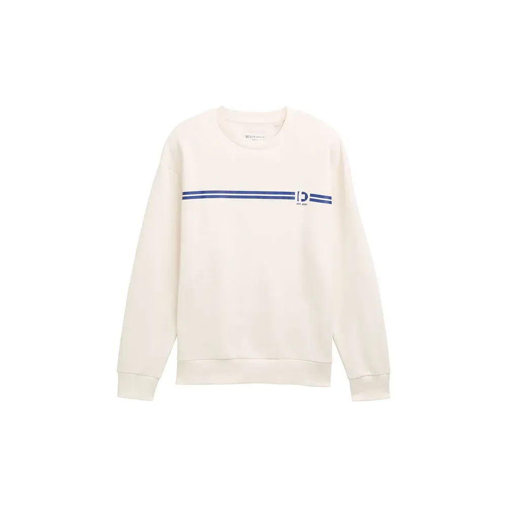 Толстовка с круглым вырезом и полосатым принтом на груди.