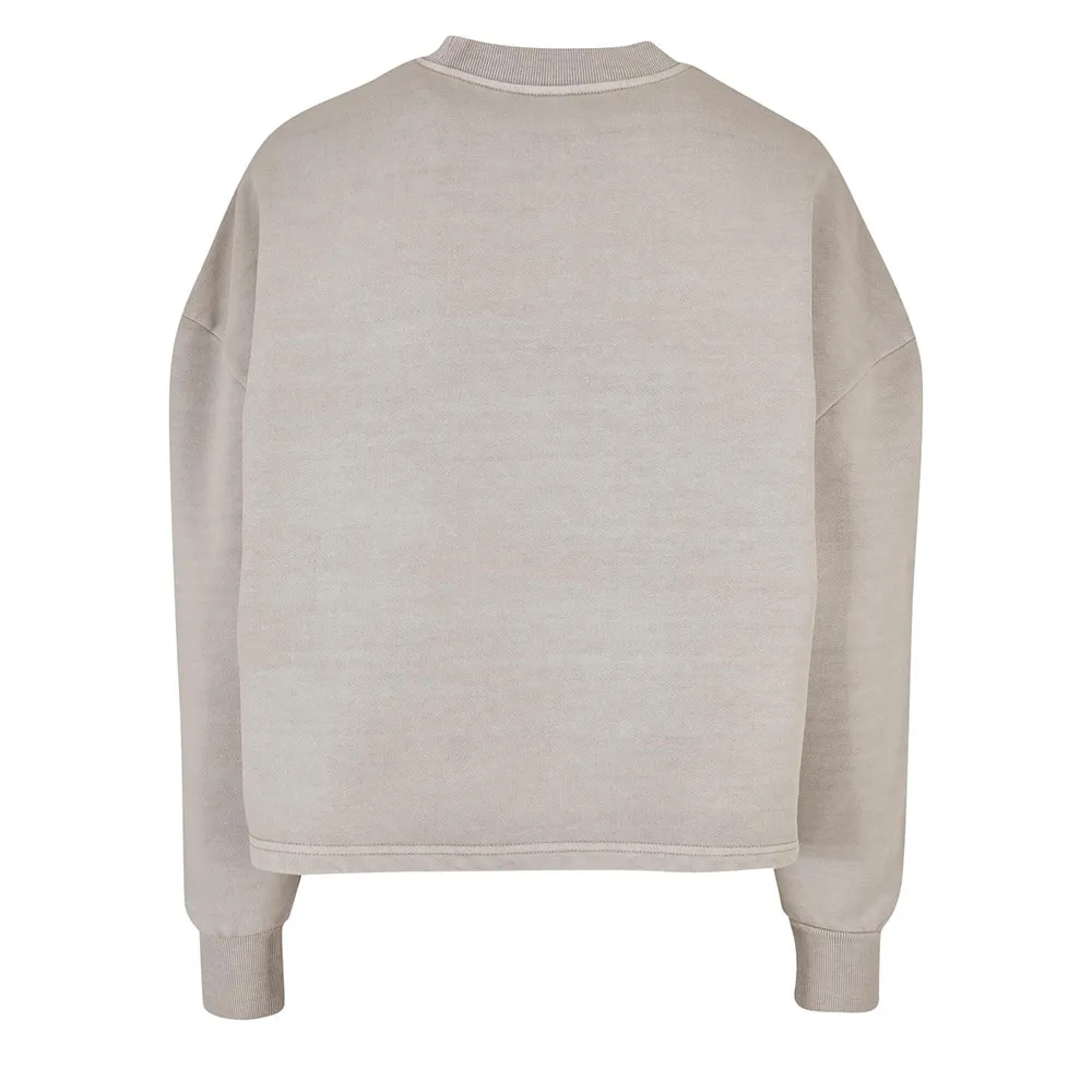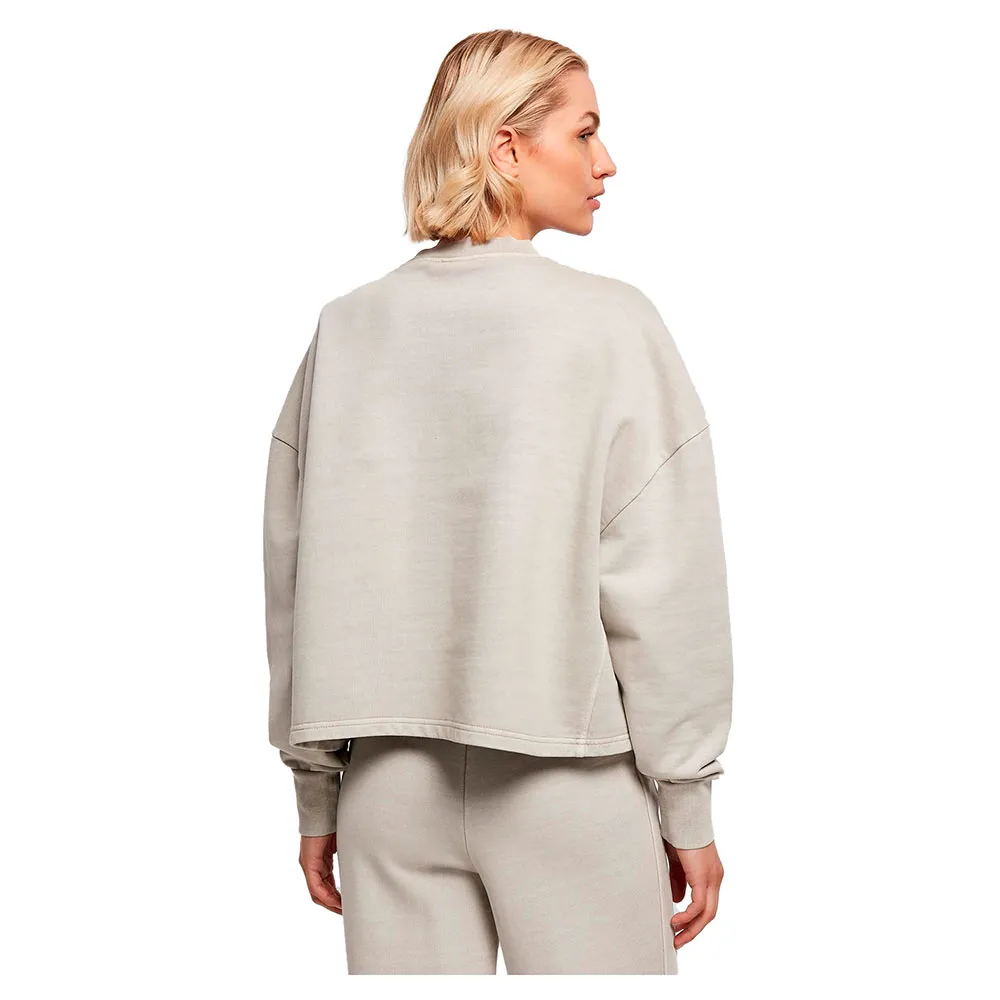 Женская кофта с круглым вырезом имеет спортивный и повседневный вид благодаря отбеленной ткани, свободному крою oversize, спущенной линии плеча и слегка разрезам по бокам. V-образная вставка спереди на ребристой круглой горловине создает акцент, а широкие манжеты также ребристой отделки. Женская кофта с круглым вырезом выполнена из плотного хлопкового махрового трикотажа.