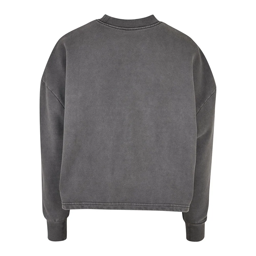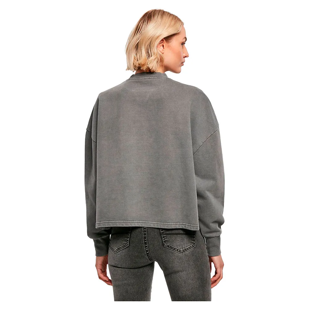 Женская кофта с круглым вырезом имеет спортивный и повседневный вид благодаря отбеленной ткани, свободному крою oversize, спущенной линии плеча и слегка разрезам по бокам. V-образная вставка спереди на ребристой круглой горловине создает акцент, а широкие манжеты также ребристой отделки. Женская кофта с круглым вырезом выполнена из плотного хлопкового махрового трикотажа.