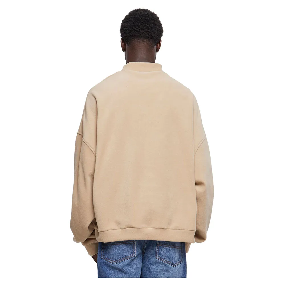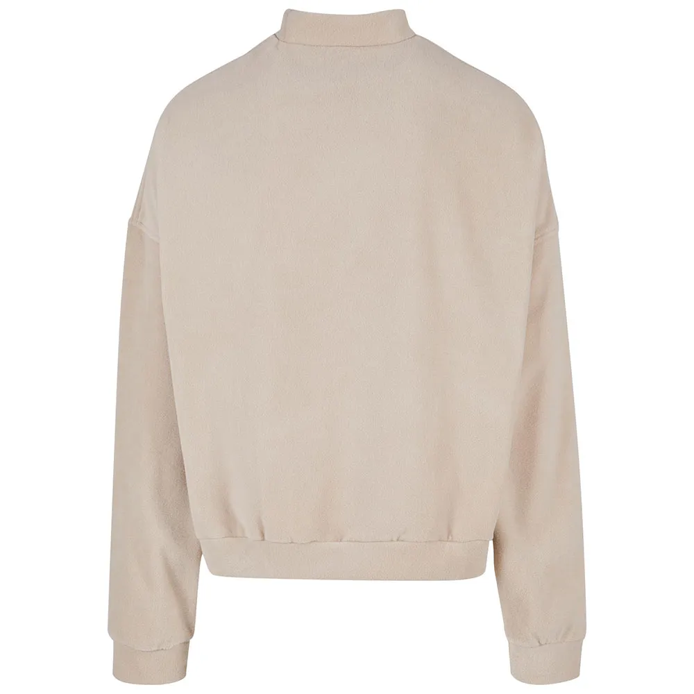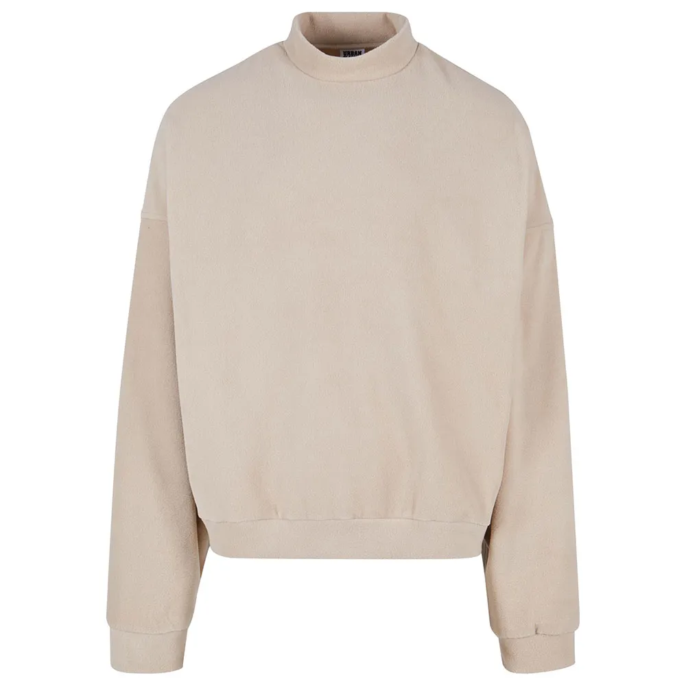 Простая мужская толстовка с небольшим воротником и широкими манжетами в рубчик на рукавах и подоле. Простой образ дополняют широкие манжеты на рукавах и подоле. Этот мужской свитер вне времени благодаря свободному крою с приспущенной линией плеч. Он изготовлен из мягкого флиса.