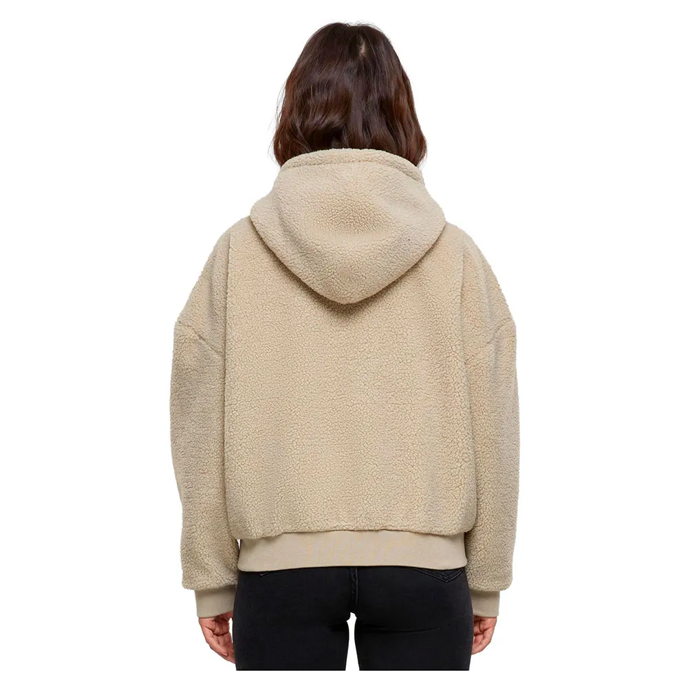 Укороченная женская куртка с капюшоном — настоящая модная вещь благодаря пушистой ткани шерпа. Она традиционно оснащена большим капюшоном, боковыми карманами и молнией спереди. Модный свободный крой с сильно спущенными плечами обеспечивает непринужденный вид. Ребристые манжеты на рукавах и подоле дополняют спортивный образ. Внутренняя часть женской толстовки с капюшоном на молнии отделана тонким гладким шармезом.