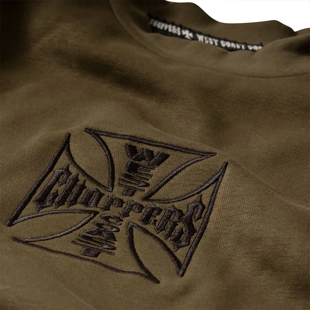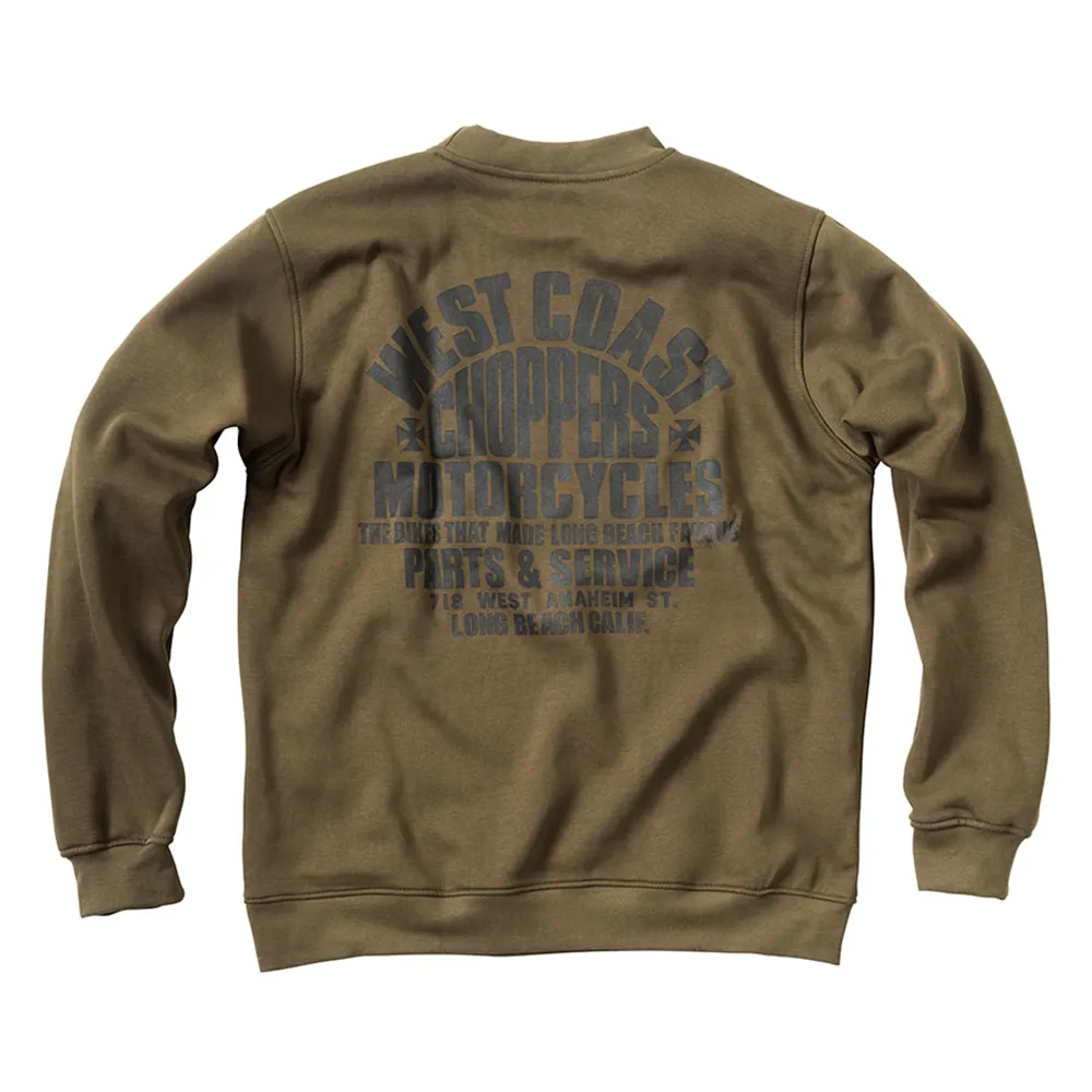 Зеленый свитер wcc с вышитым крестом спереди и принтом деталей и услуг сзади.