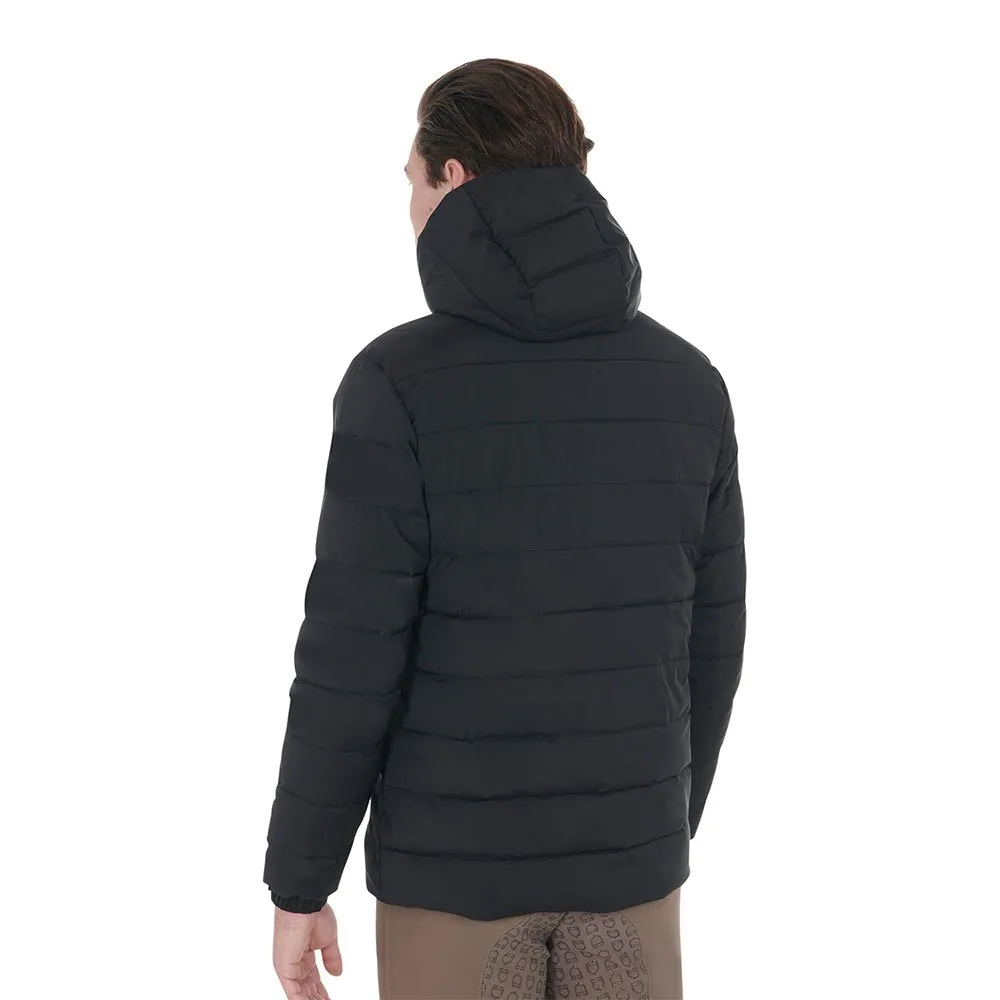 Мужская пуховая куртка из эластичной технической ткани с проклеенной передней застежкой-молнией, украшенной эргономичным силиконовым бегунком для легкого и безопасного открывания и закрывания.