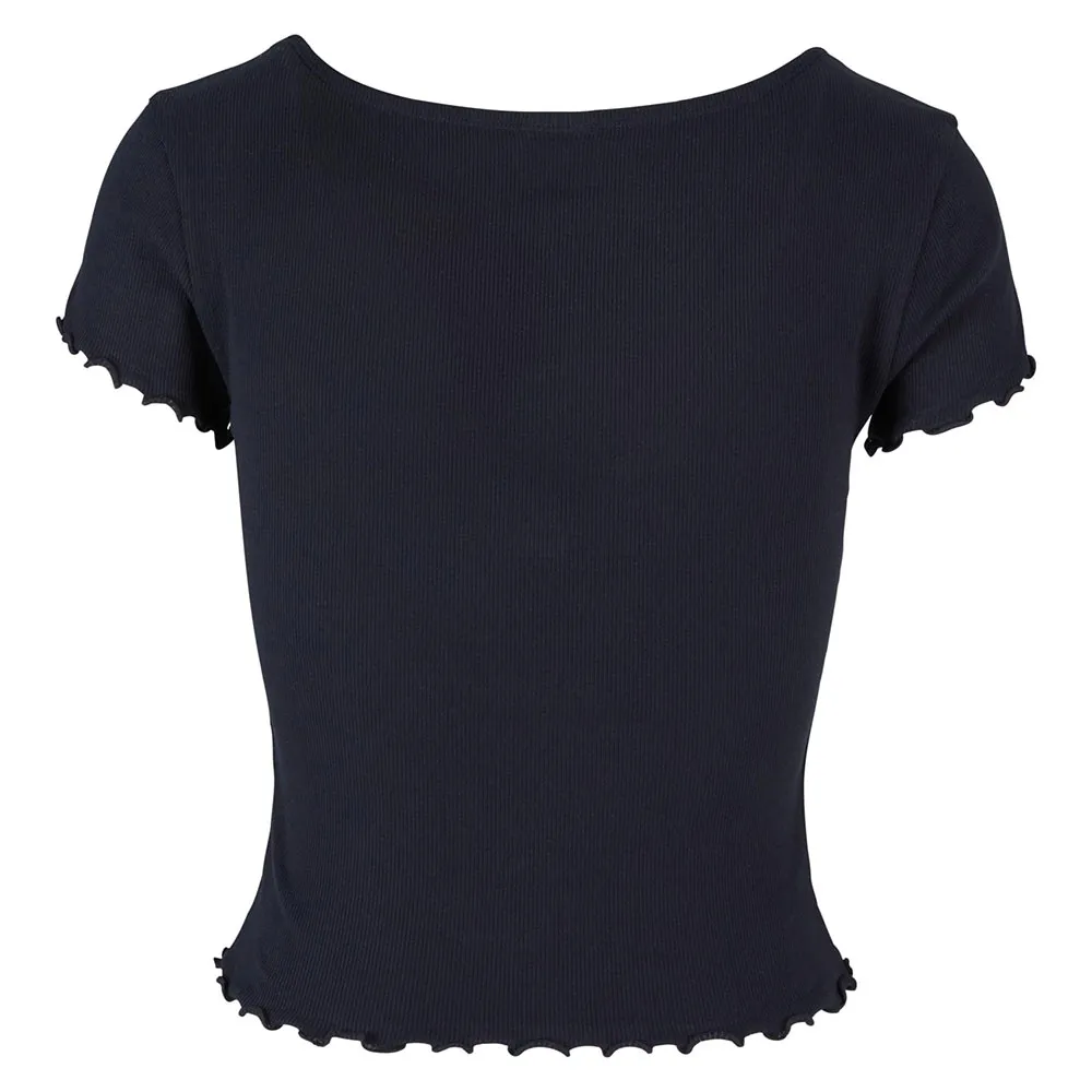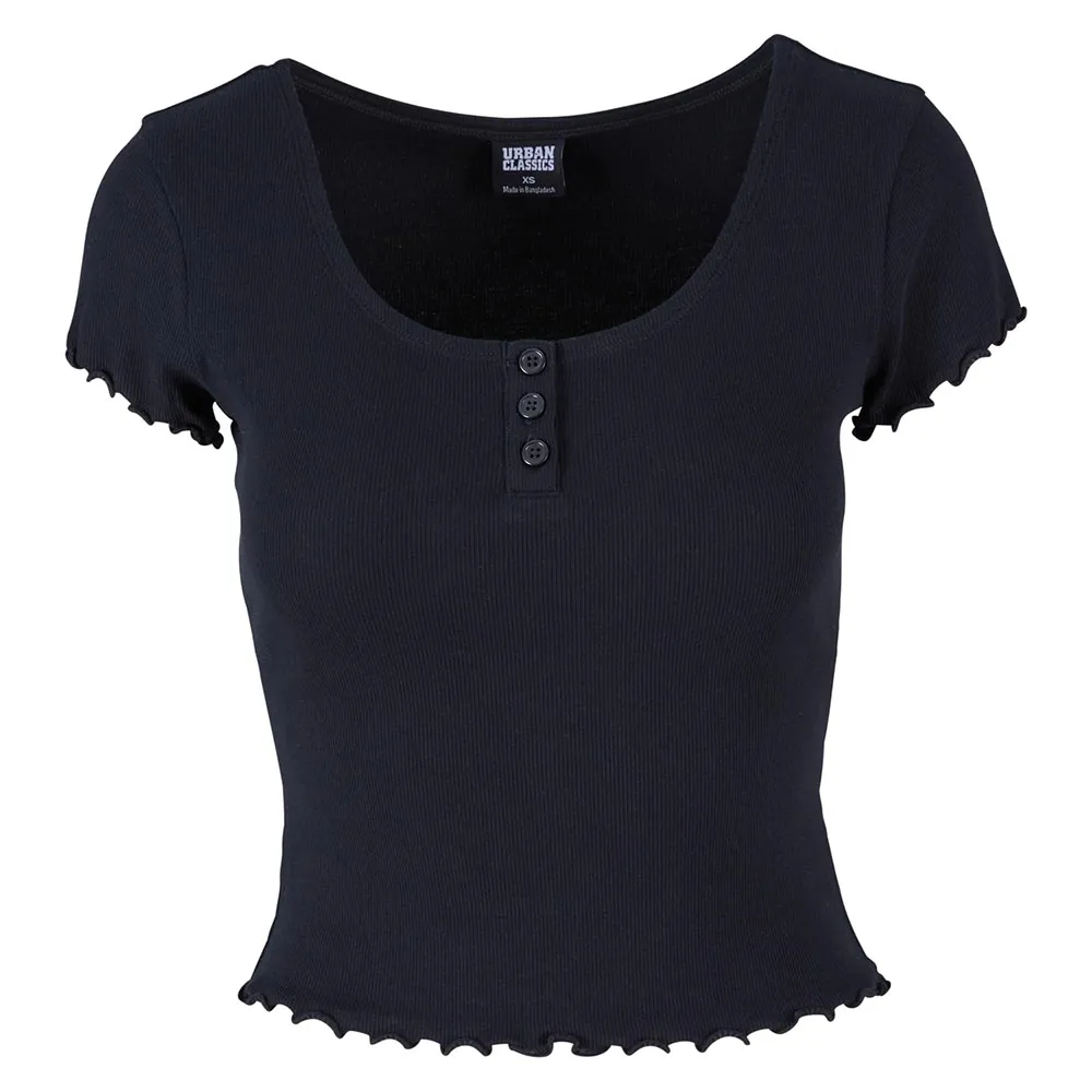 Игривая и нежная — эта женская футболка с короткими рукавами искусно задаёт тон. Большой круглый вырез горловины заканчивается изящной планкой с пуговицами. Рукава и подол также оформлены изящной волнистой отворотной кромкой. Женская футболка изготовлена из хлопка с эластаном. Облегающий крой.