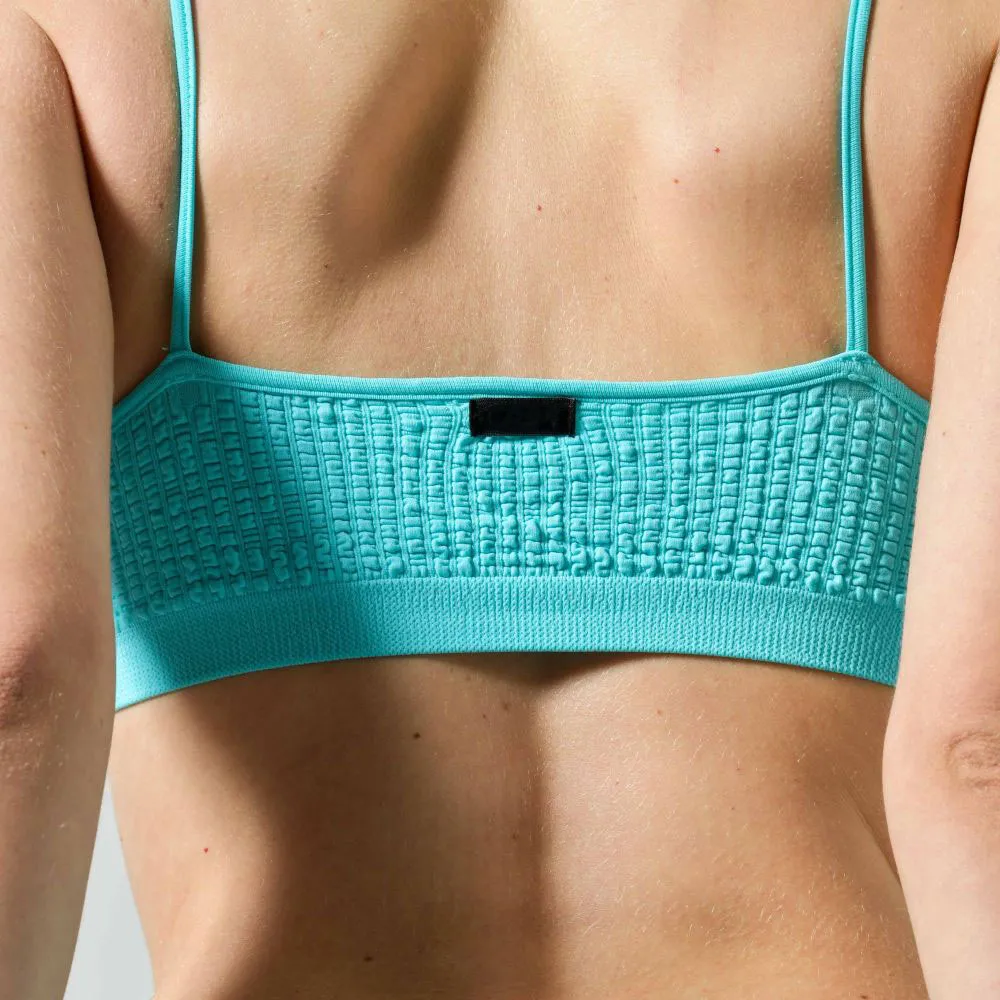 Двойной плетеный верх из микрофибры спереди, без косточек, тонкая бретелька с квадратным вырезом спереди и сзади.