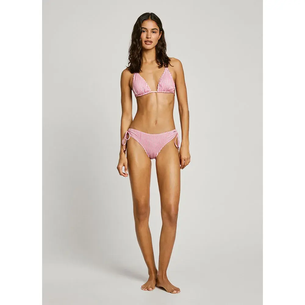 Треугольный топ с принтом и съемной подкладкой из мягкой переработанной быстросохнущей полиэстеровой ткани, регулируемые бретельки с декоративными бусинами.