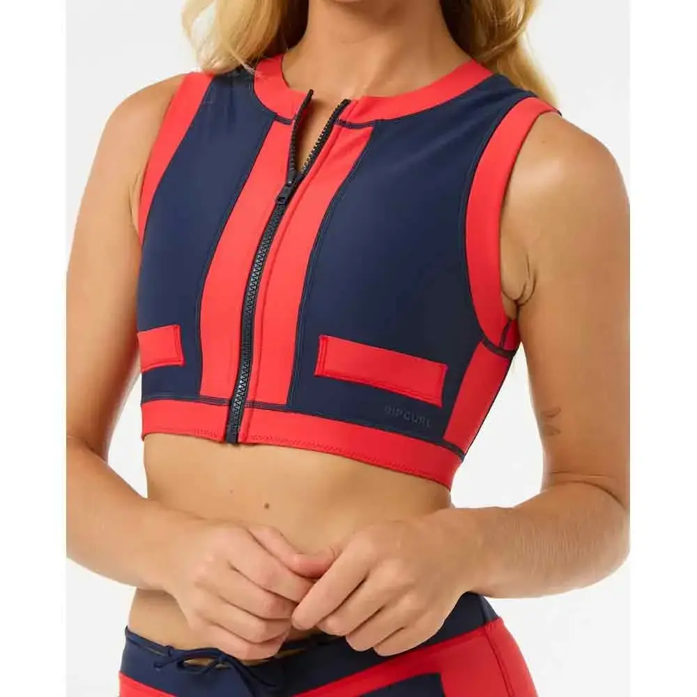 Изготовлен из связанного полиамида, этот жилет с короткими рукавами дополнен логотипами, нанесенными методом термопереноса высокой плотности, плоским швом и молнией спереди.