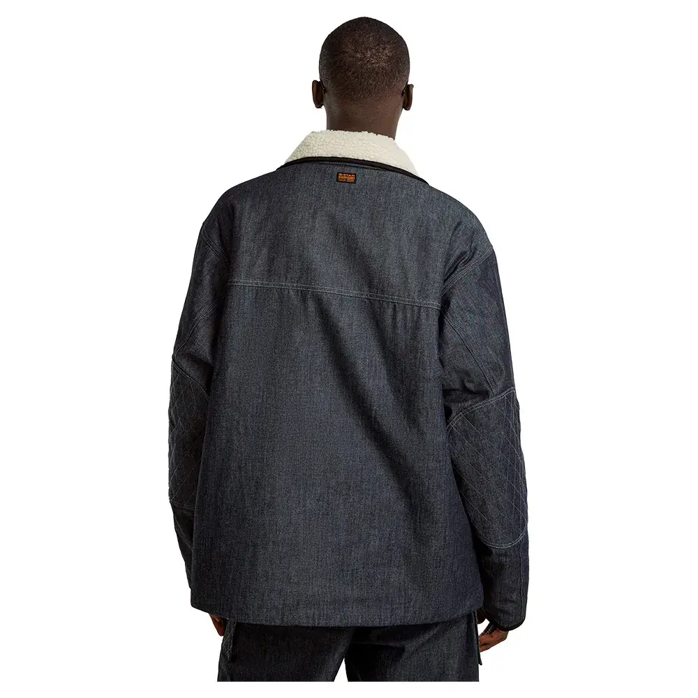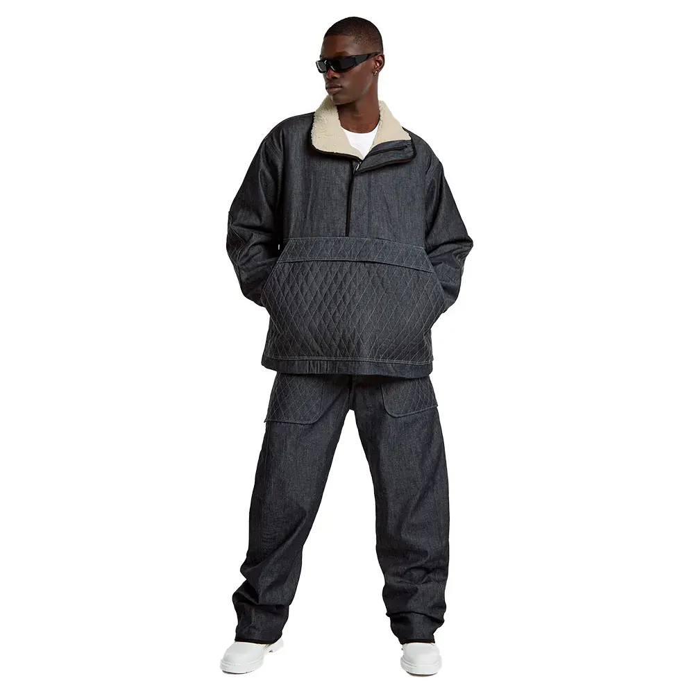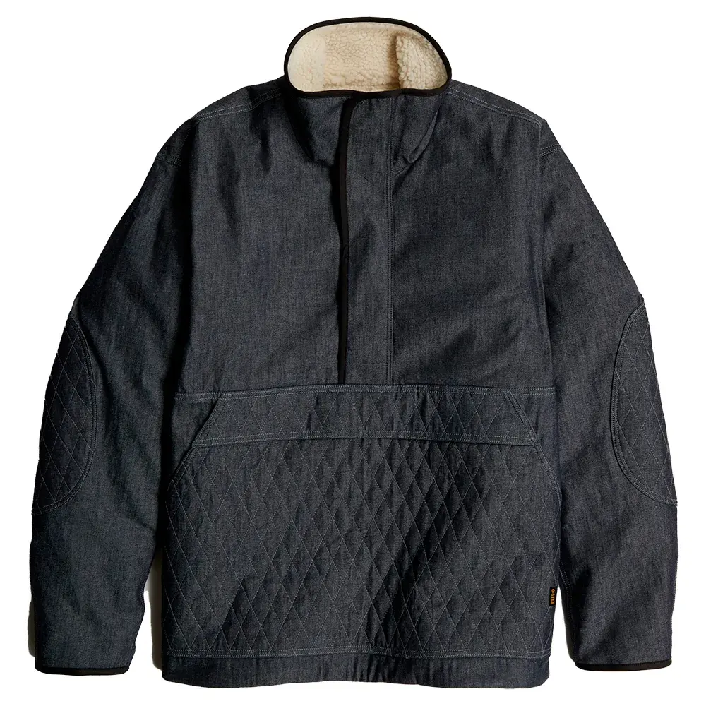 Этот джинсовый анорак имеет карман на молнии спереди, а снизу — карман-кенгуру.