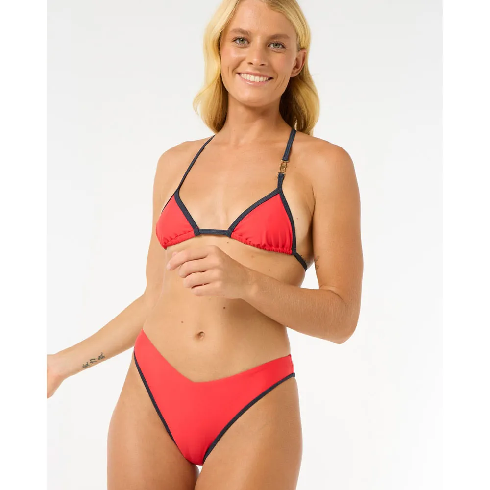 Этот треугольный бикини-топ отличается стильным дизайном с регулируемыми бретельками, контрастной окантовкой и логотипами в виде космических поцелуев с металлическими украшениями.