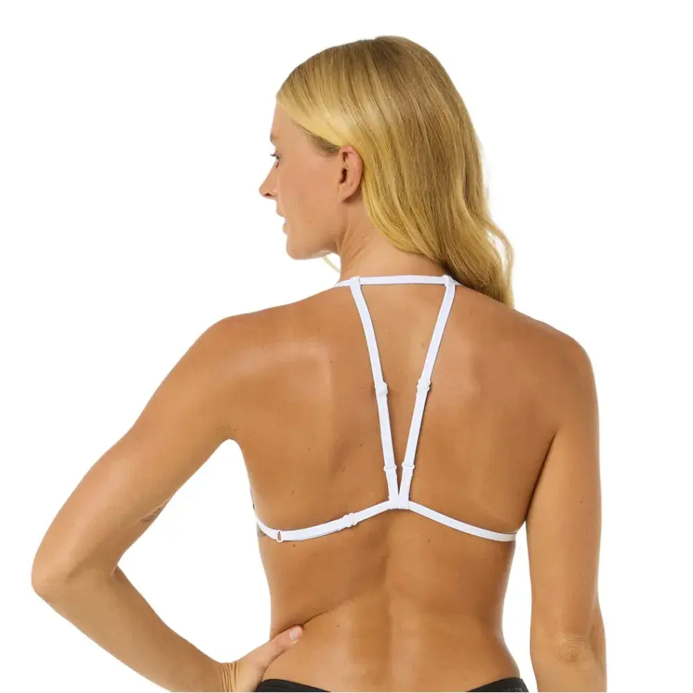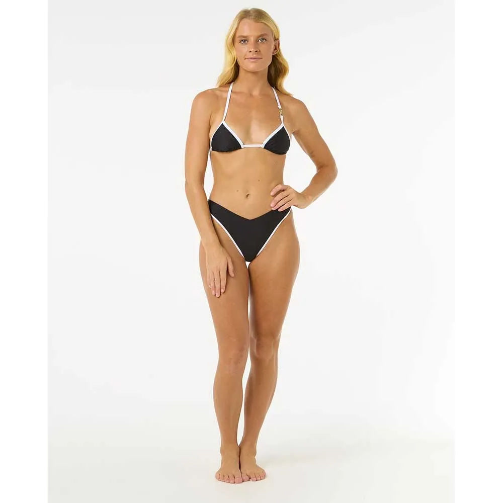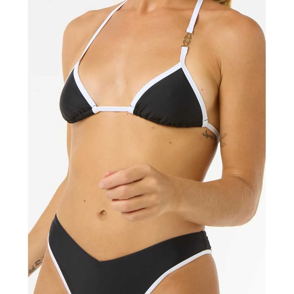 Этот треугольный бикини-топ отличается стильным дизайном с регулируемыми бретельками, контрастной окантовкой и логотипами в виде космических поцелуев с металлическими украшениями.