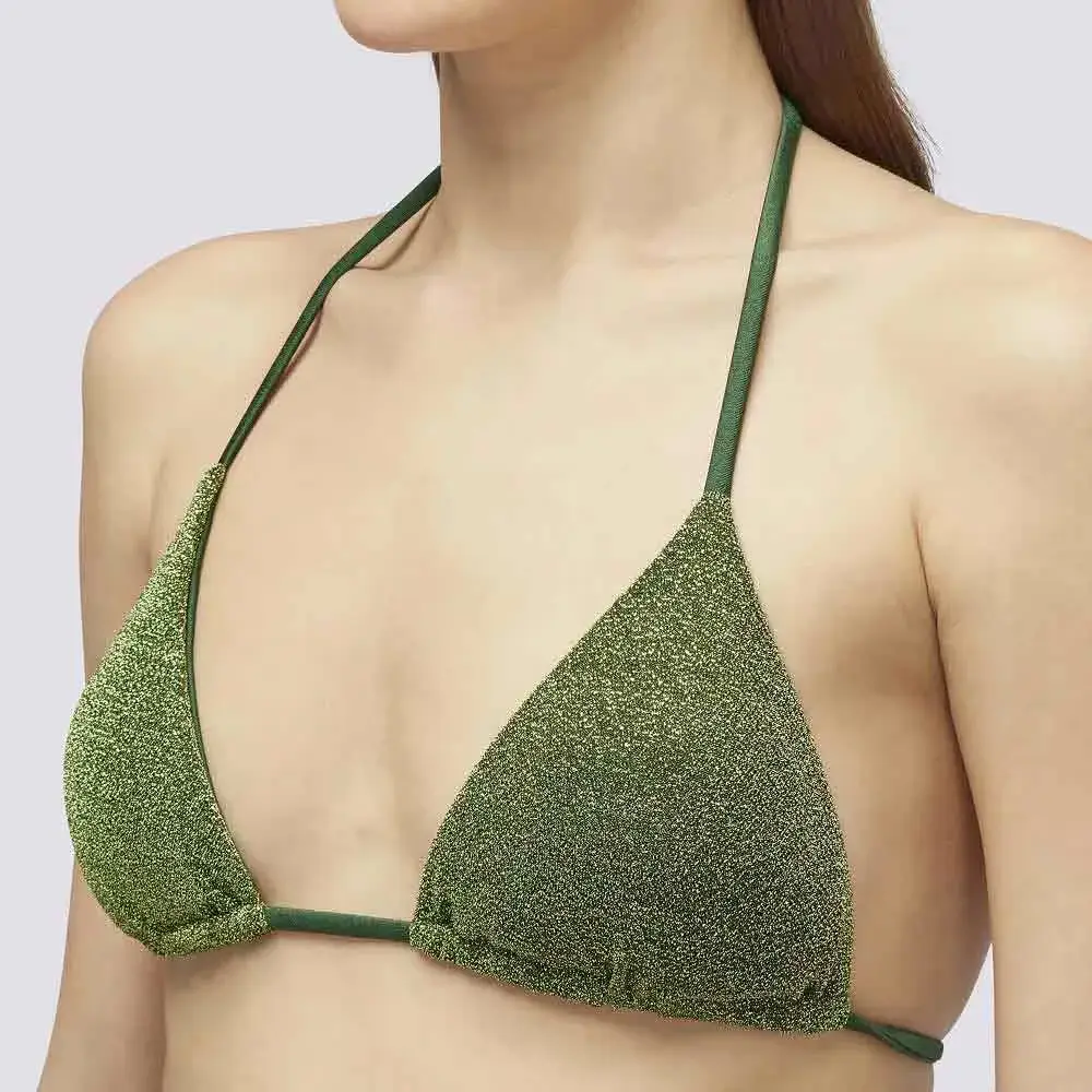Яркость люрекса — это деталь этого треугольного топа, который отлично сочетается с соответствующим низом, создавая ультрашикарный образ.