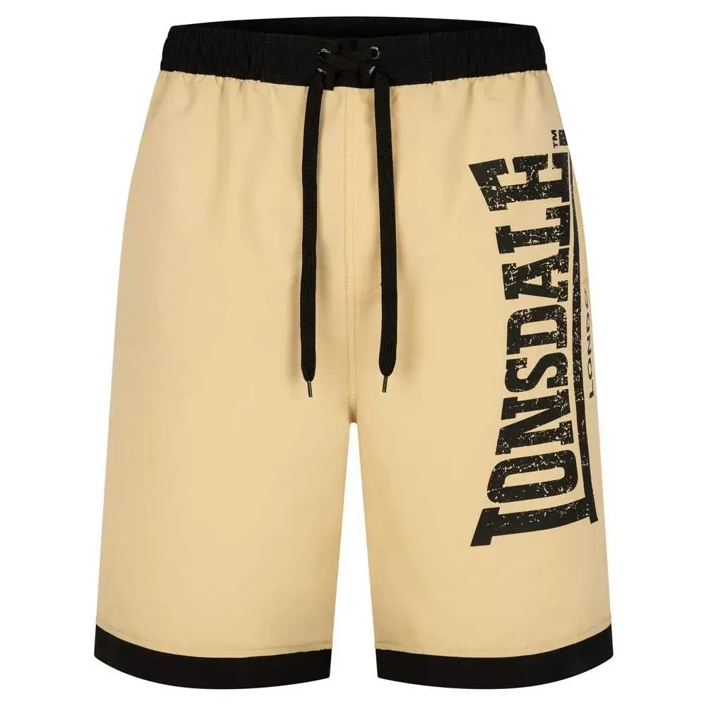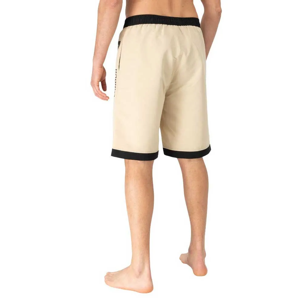 Одноцветные плавки с контрастными деталями, такими как большой принт с логотипом на левой штанине, вставки на подоле/поясе и завязки. Два боковых кармана и застежка на липучке под пришитой имитацией гульфика спереди.