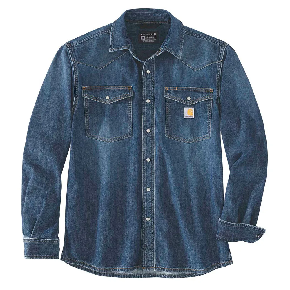 Джинсовая рубашка с длинным рукавом и застежкой на кнопку спереди.