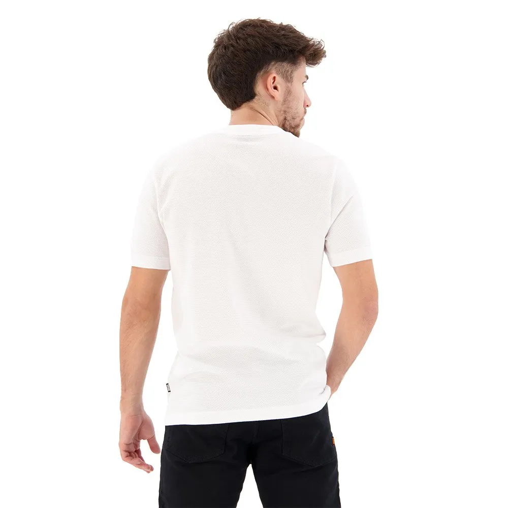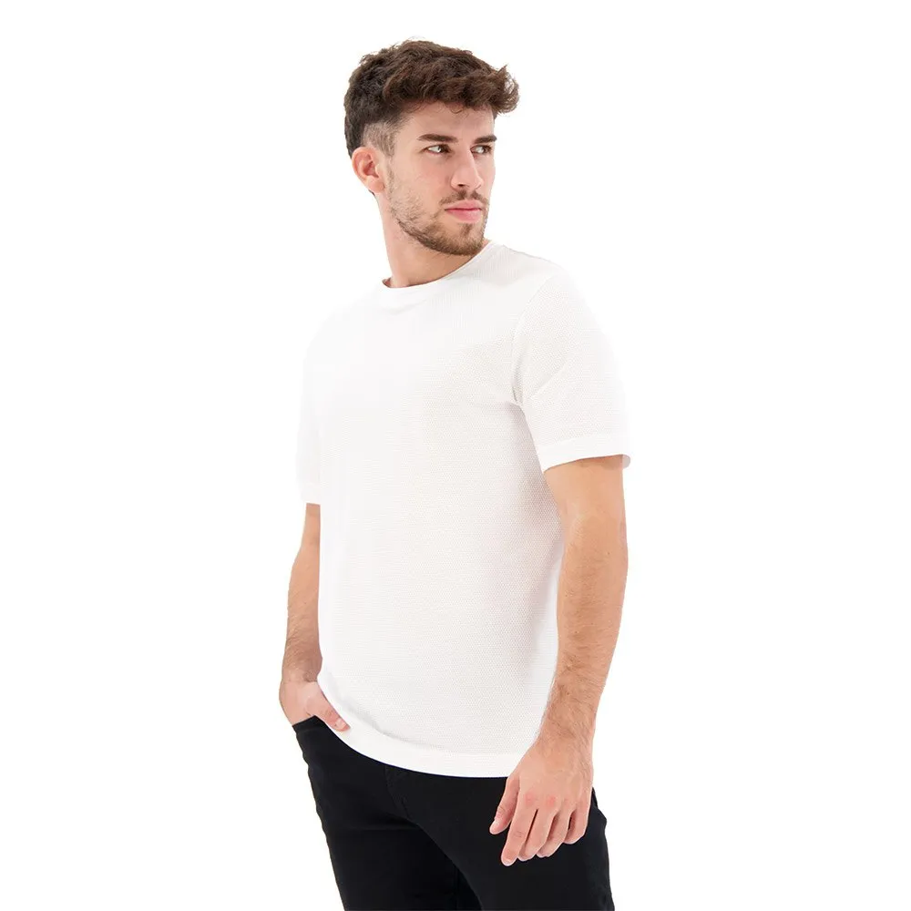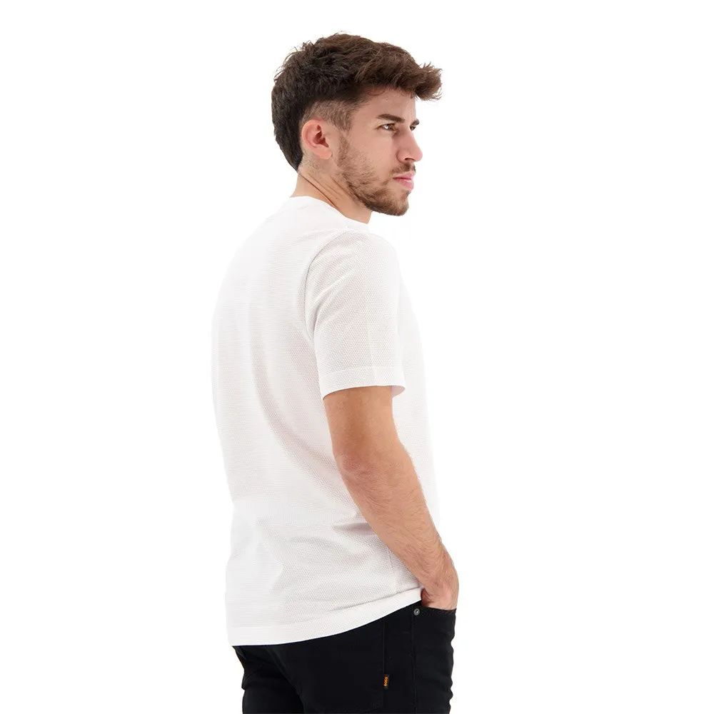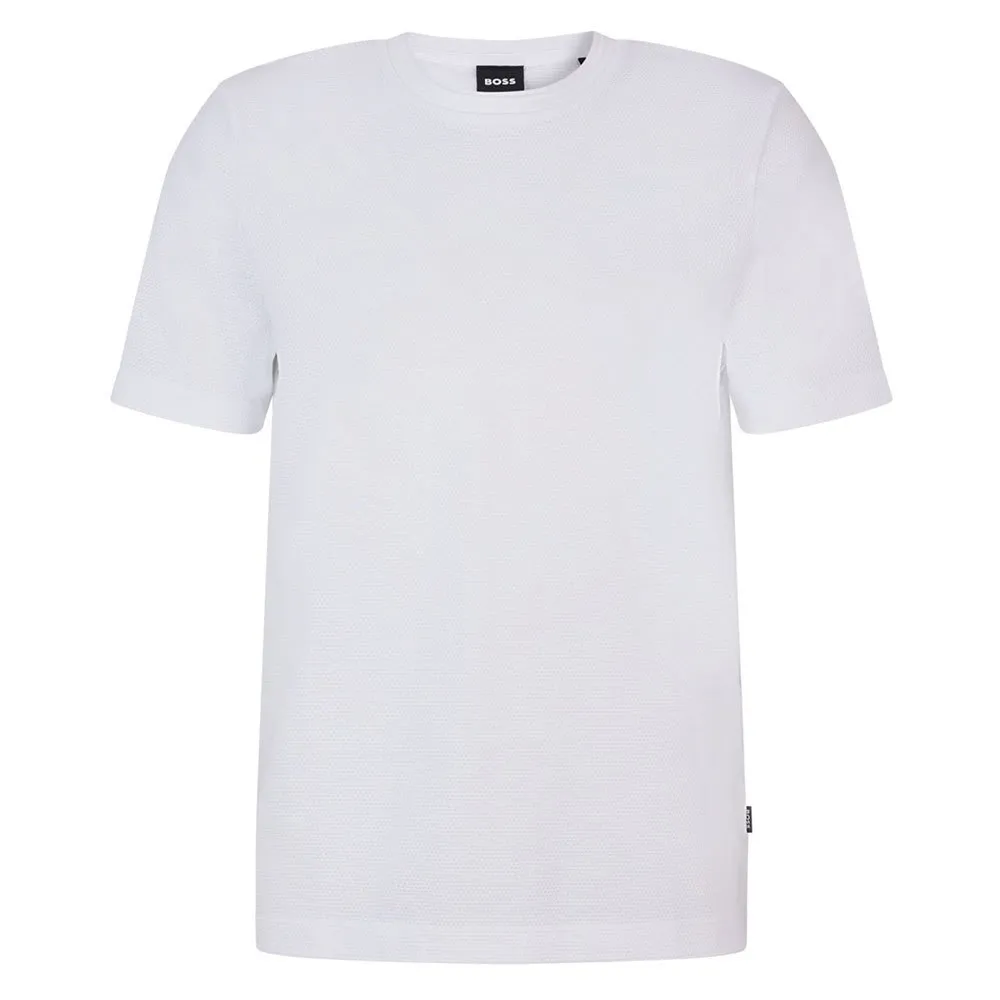 Футболка с круглым вырезом от BOSS Menswear с пузырьковой структурой, созданной жаккардовой техникой. Эта модель прямого кроя с короткими рукавами выполнена из хлопковой смеси и дополнена лаконичным хлопковым воротником в рубчик и флажком с логотипом на боковом шве. Мулине придает этой футболке особый эффект.