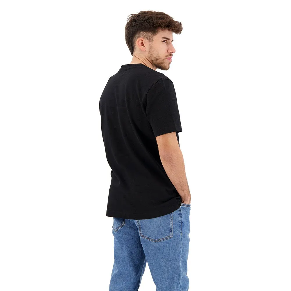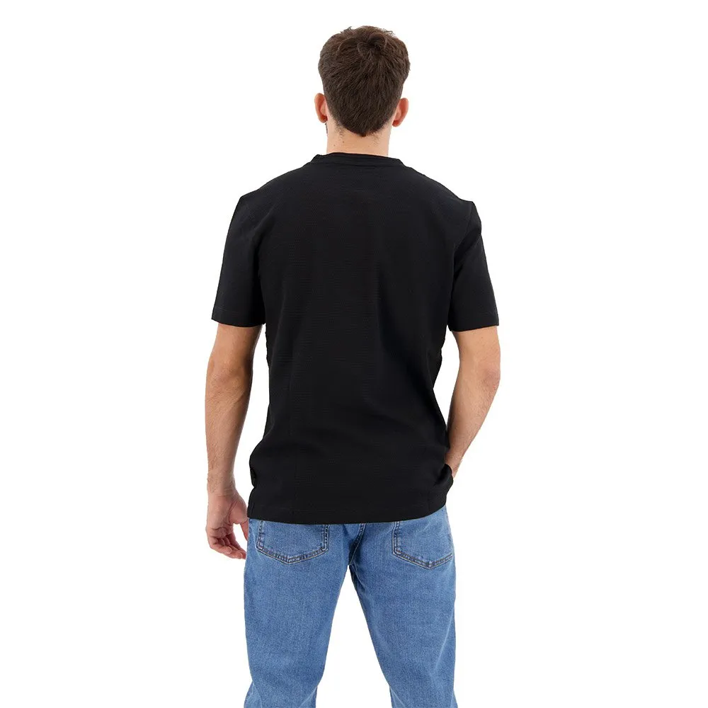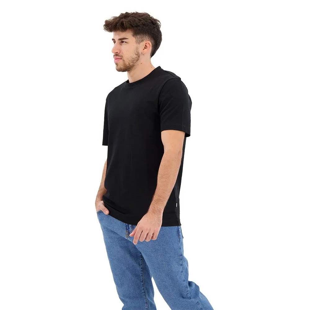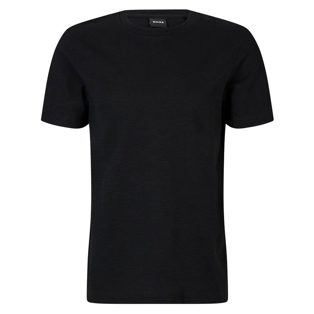 Футболка с круглым вырезом от BOSS Menswear с пузырьковой структурой, созданной жаккардовой техникой. Эта модель прямого кроя с короткими рукавами выполнена из хлопковой смеси и дополнена лаконичным хлопковым воротником в рубчик и флажком с логотипом на боковом шве. Мулине придает этой футболке особый эффект.