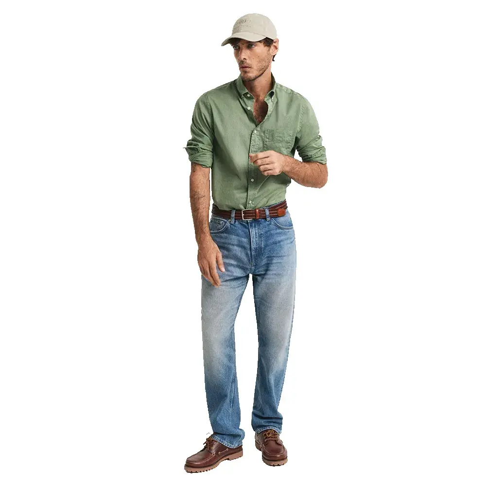 Эта рубашка окрашена в готовом виде с эффектом выцветания на солнце для создания ощущения носки, имеет классический крой и классический воротник на пуговицах.