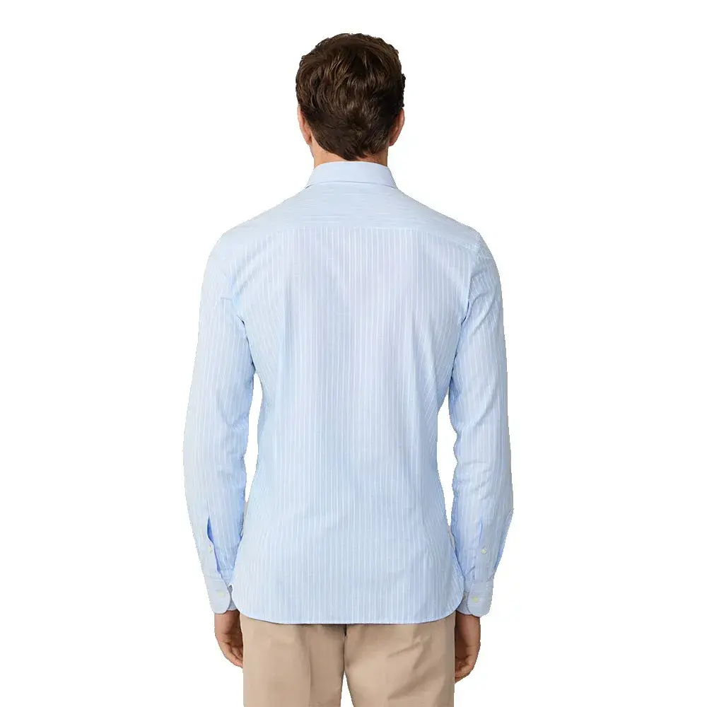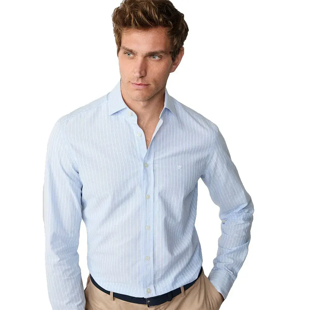 Небесно-голубая полосатая хлопковая ткань имеет рельефную текстуру для повседневного, но в то же время изысканного образа.