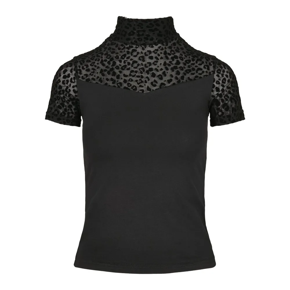 Элегантная и необычная женская футболка, в которой умело сочетаются два разных материала. Удобный эластичный трикотаж в области плеч сменяется соблазнительной прозрачной сеткой, которая также украшена сплошным флокированным леопардовым принтом. Футболка отлично облегает тело, а функциональная и удобная двухслойная водолазка завершает образ. Oberstoff 1: 95% Baumwolle, 5% Elasthan, одинарный трикотаж, плотность 180 г/м² Oberstoff 2: 94% Polyamid, 6% Elasthan, флокированное кружево, плотность 145 г/м²