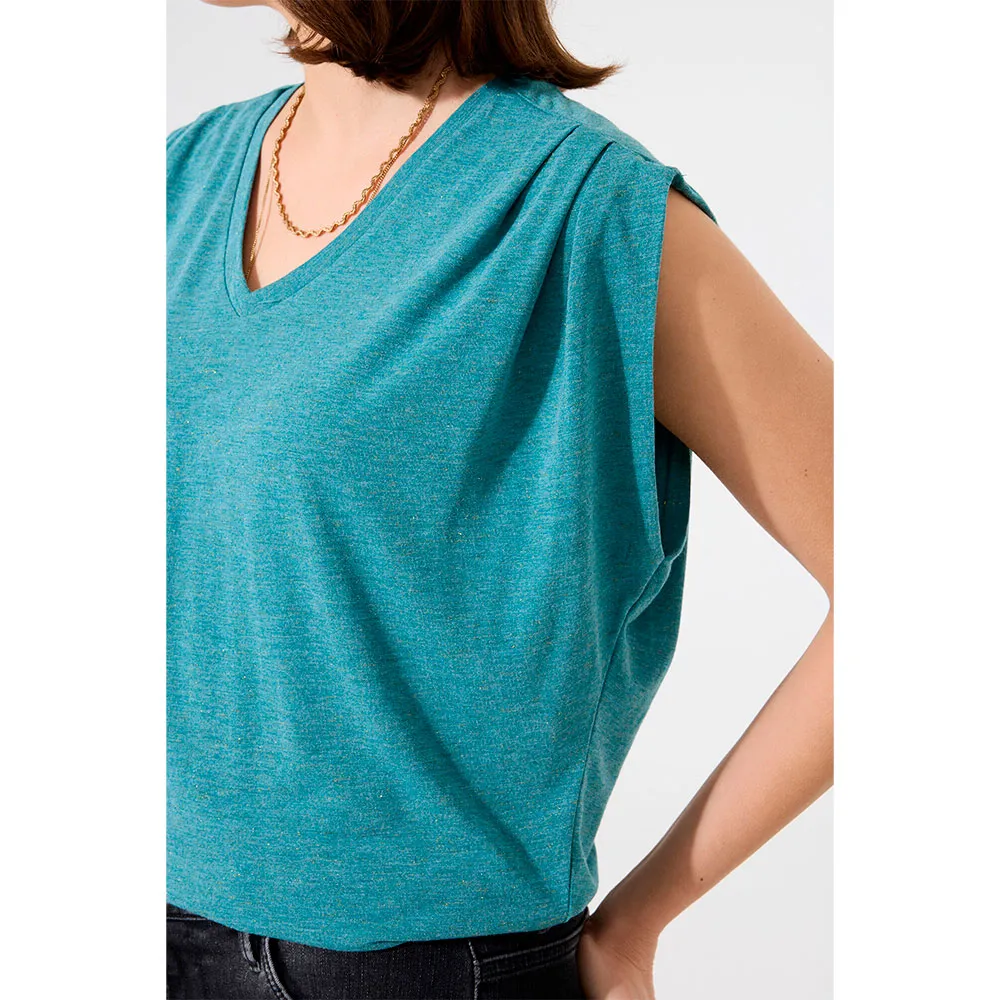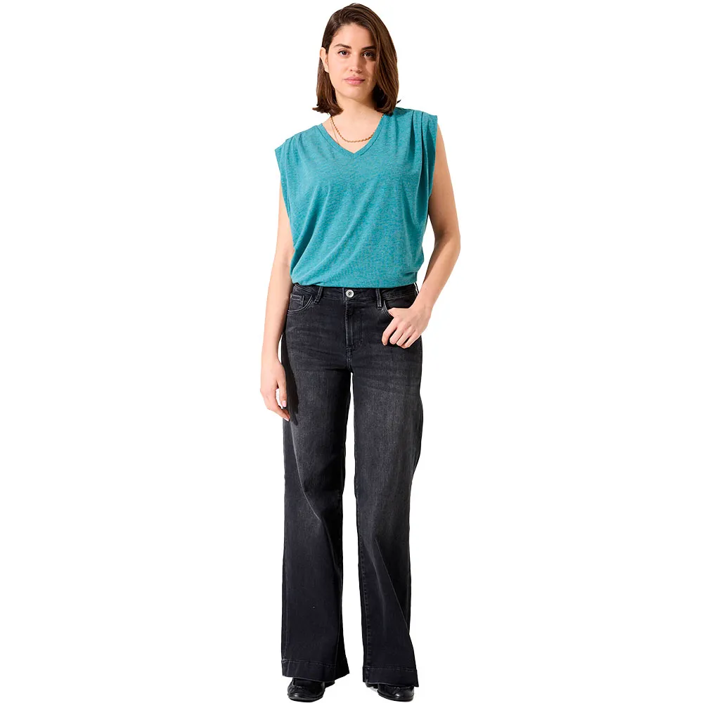 Украсьте свой повседневный образ ее прекрасно продуманными деталями. Привлекательный V-образный вырез изящно удлиняет линию горловины, обеспечивая шикарный и женственный силуэт, идеально подходящий для демонстрации ваших любимых изящных украшений. Разработанная для комфорта и свободы, безрукавка делает ее идеальным выбором для солнечных дней, пляжного отдыха или в качестве идеального многослойного элемента под блейзером или кардиганом в межсезонье. Он обеспечивает неограниченную свободу движений, гарантируя вам комфорт и прохладу с утра до вечера.