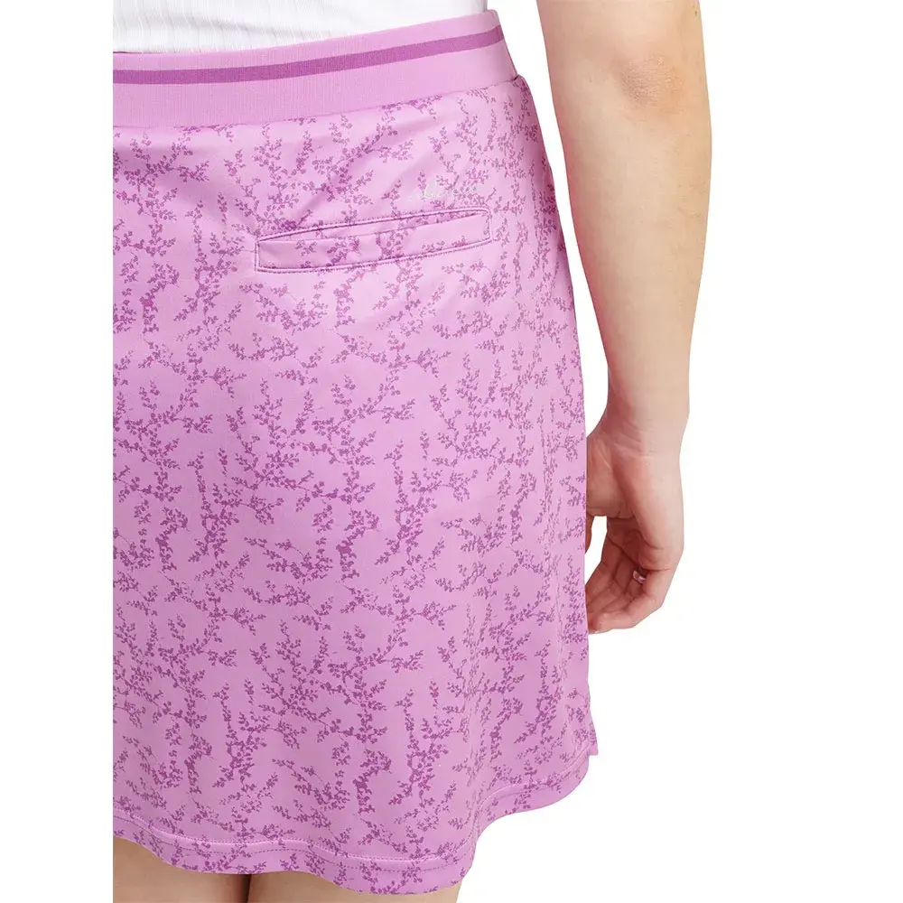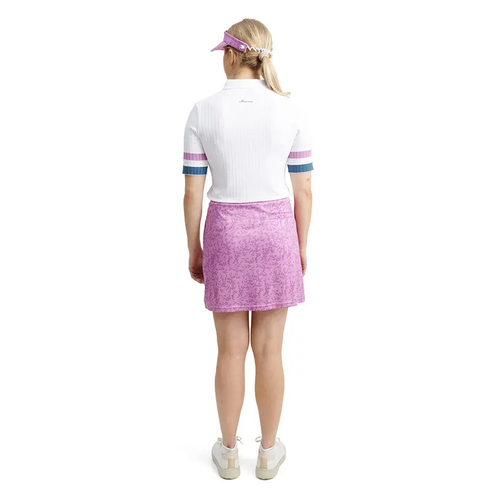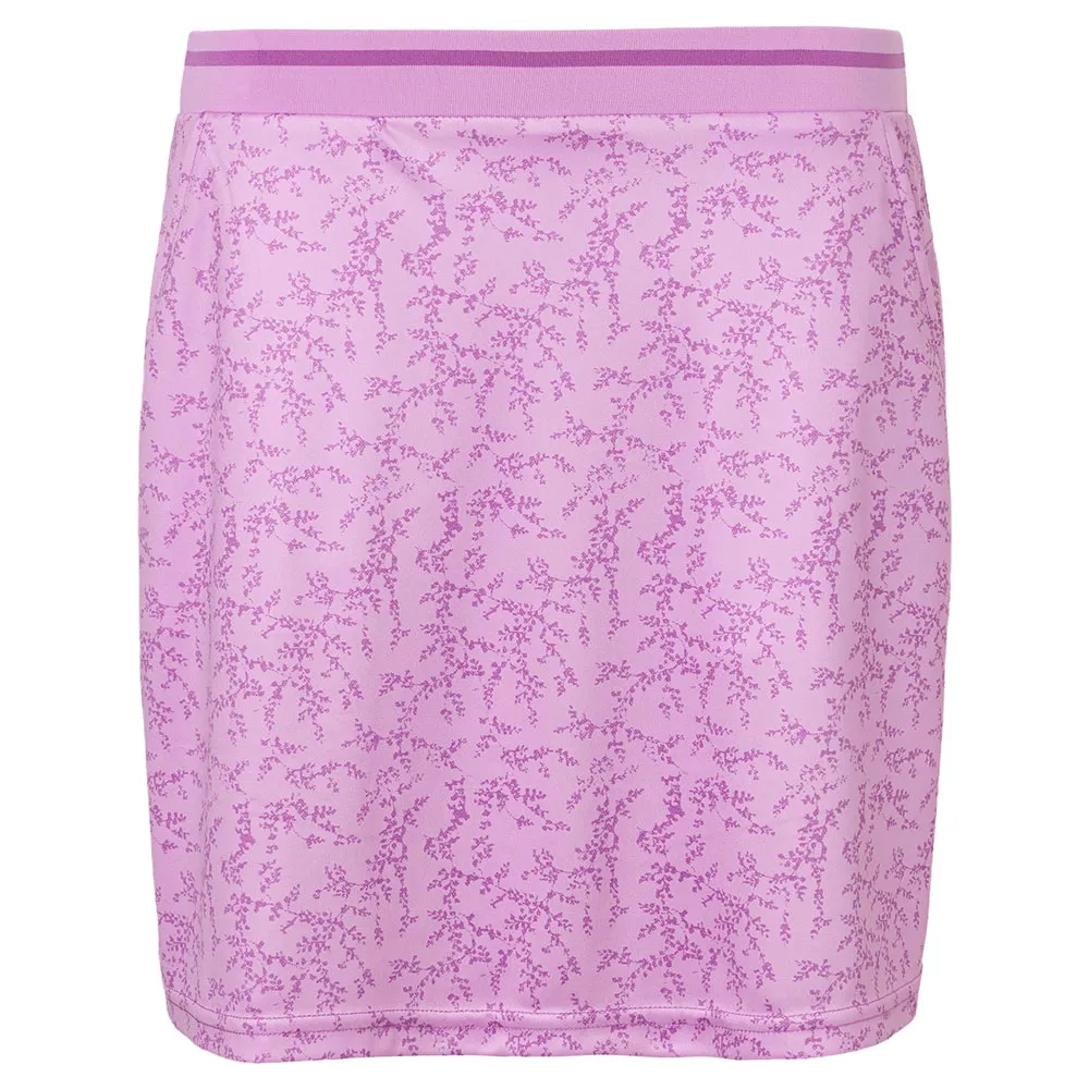 Милая юбка-шорты с приятным узором в розово-фиолетовых тонах. Юбка-шорты вишневого цвета длиной 45 см изготовлена из мягкого эластичного материала с функцией DryCool и воздухопроницаемостью. Материал слегка блестит. Трикотажный пояс с контрастной полоской. Внутренние шорты из мягкой сетки. Два передних кармана и один задний. Логотип Abacus над задним карманом.
