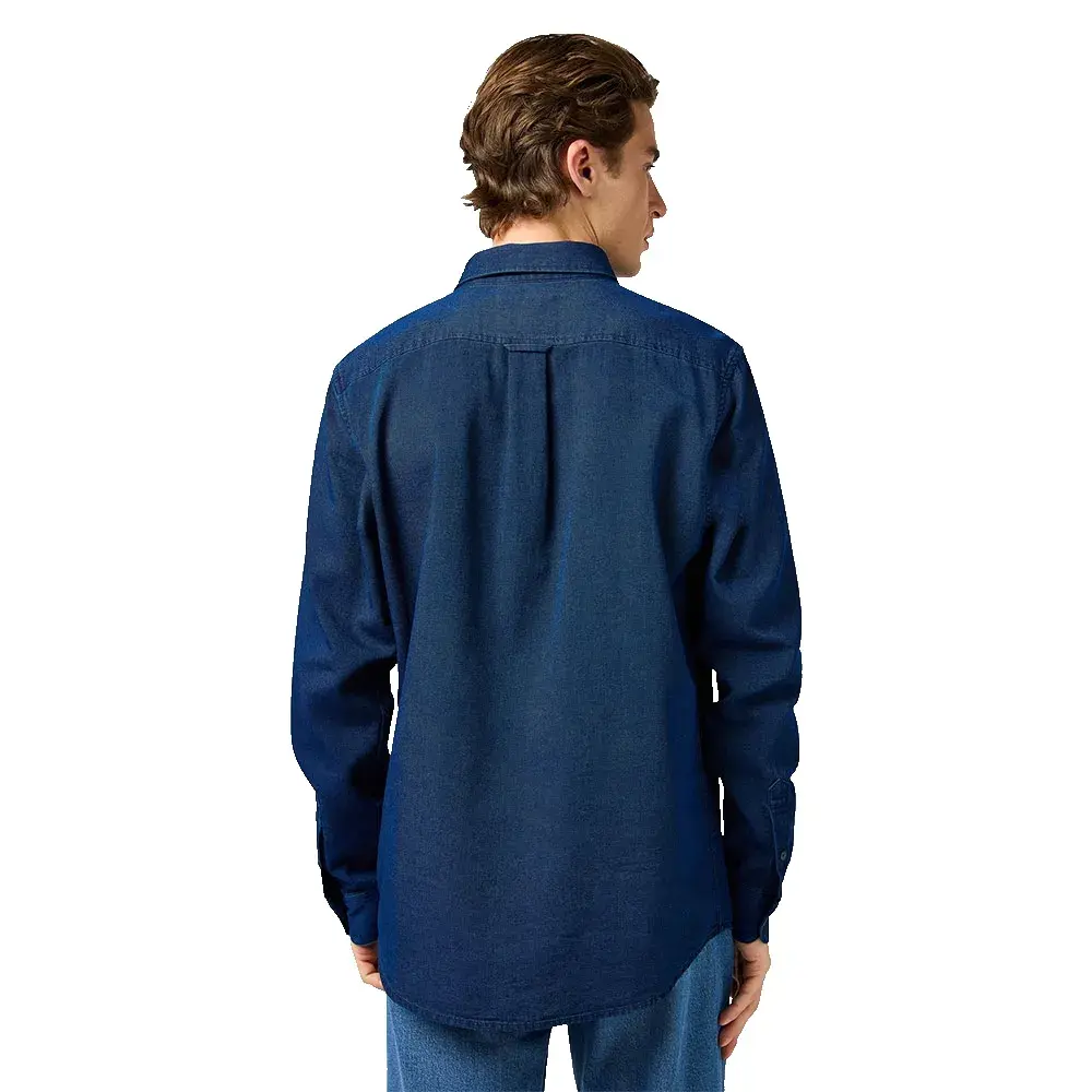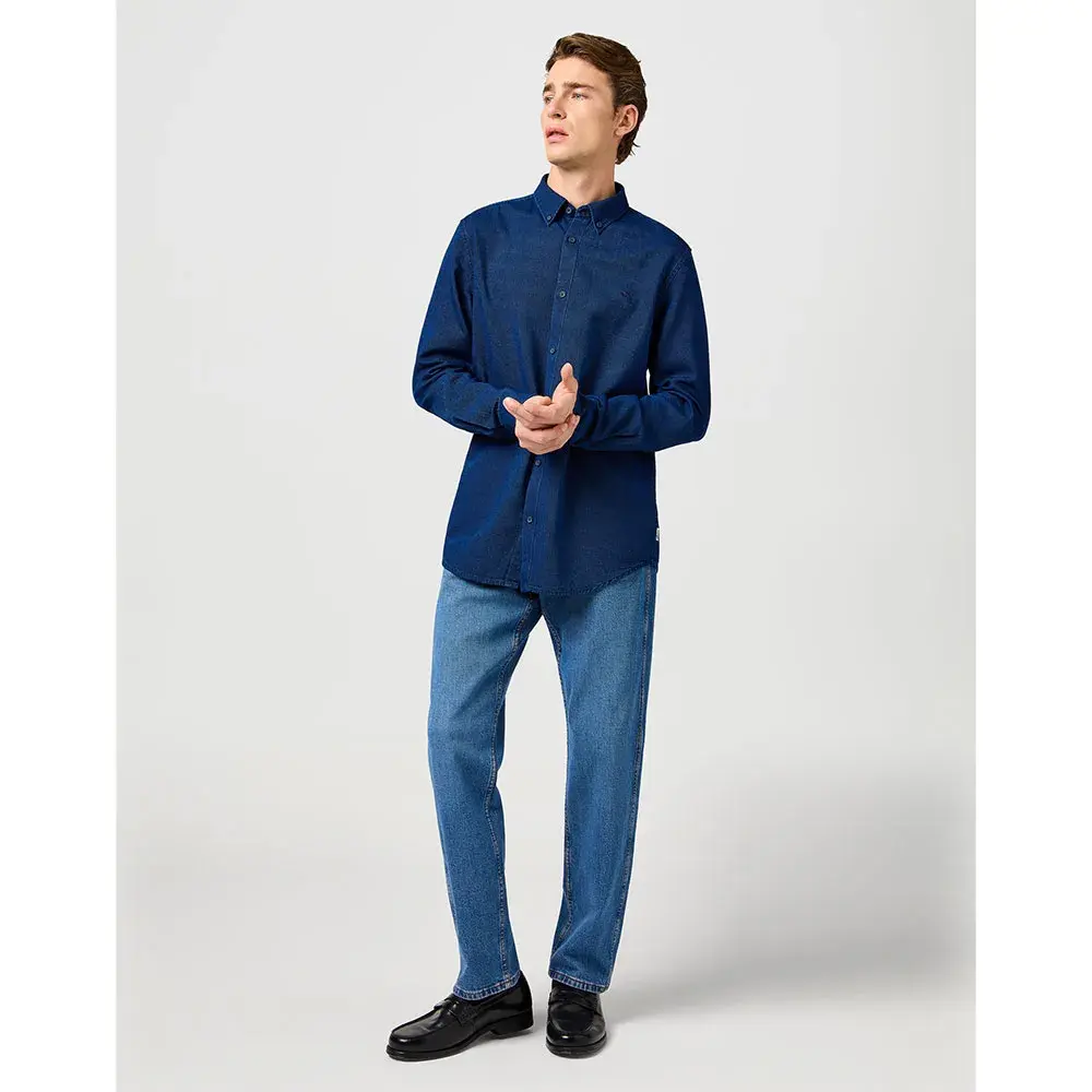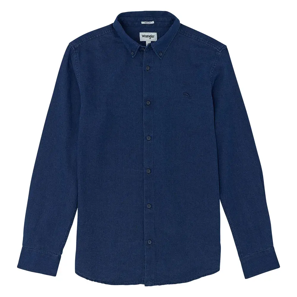 Элегантная и вневременная, наша мужская рубашка Oxford с длинным рукавом, окрашенная в цвет индиго, изготовлена из текстурированной ткани добби с закругленным подолом, воротником на пуговицах и вышитой деталью на груди.