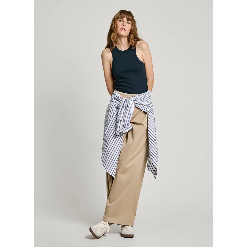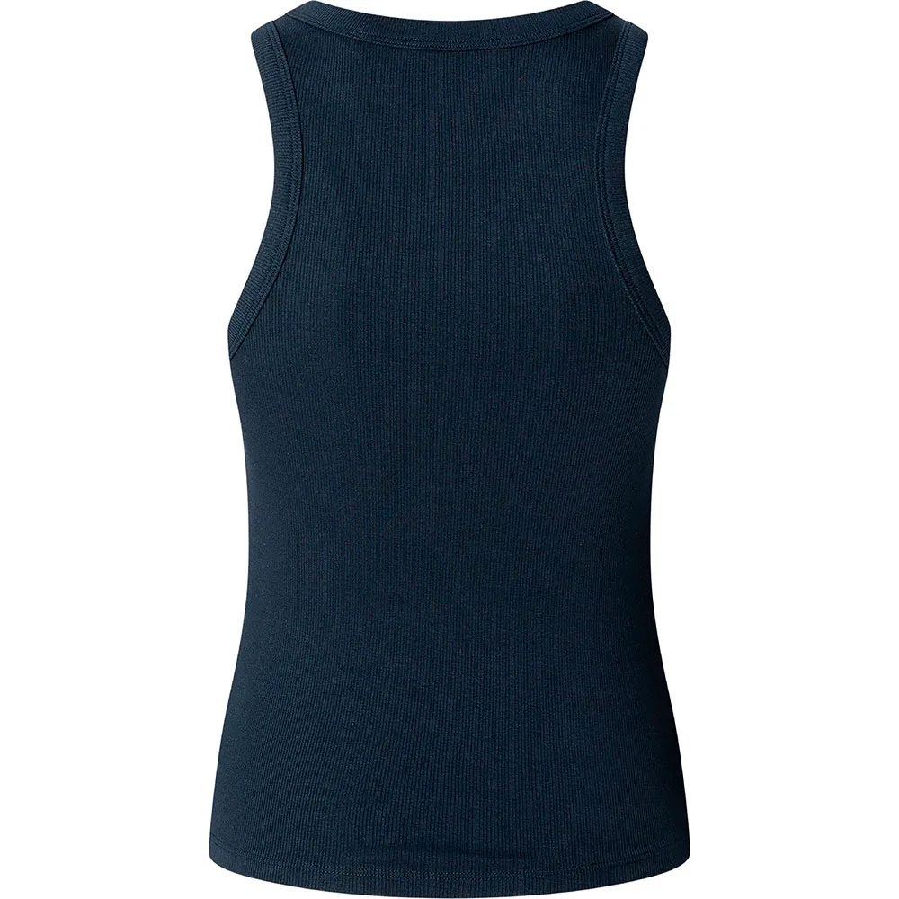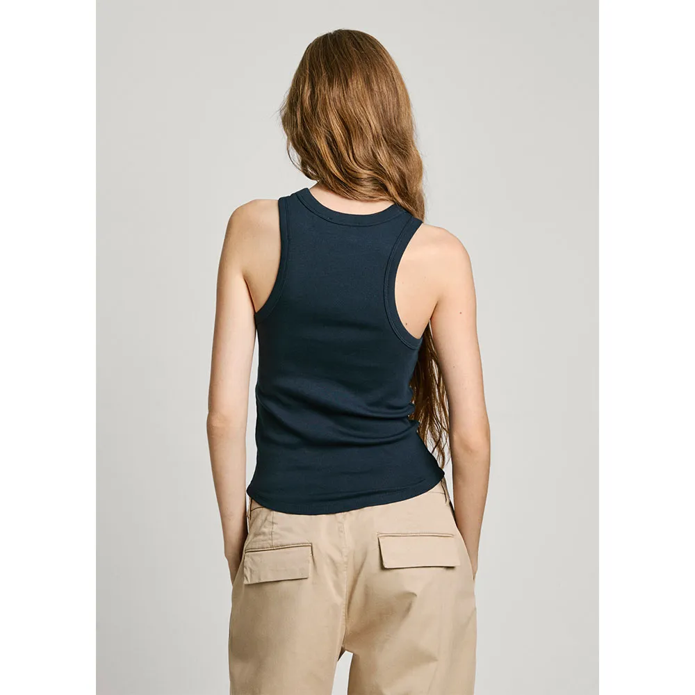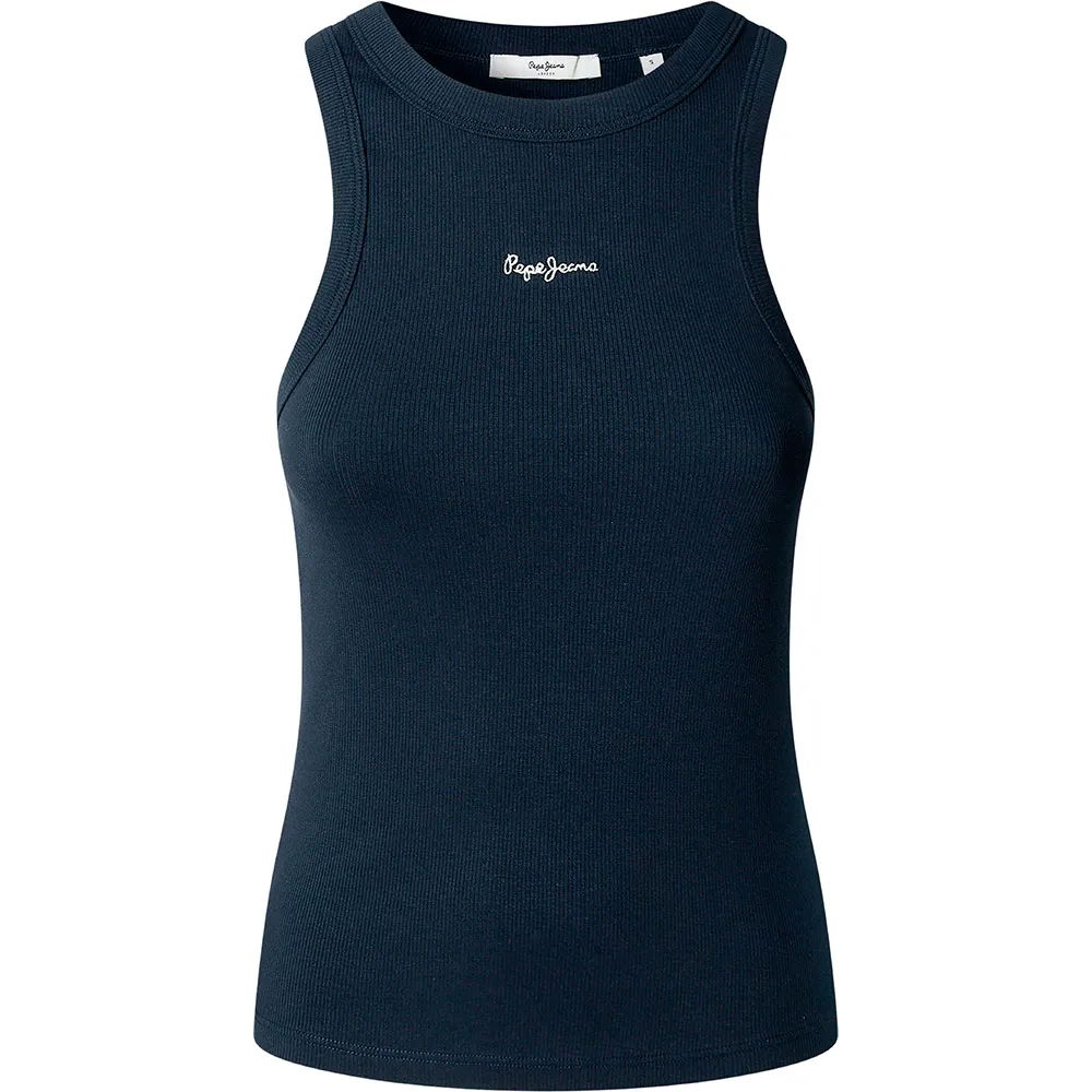 Майка без рукавов с круглым вырезом, отделкой в рубчик, с вышитым логотипом по подолу, двойной строчкой и двойной тканью на проймах и воротнике.