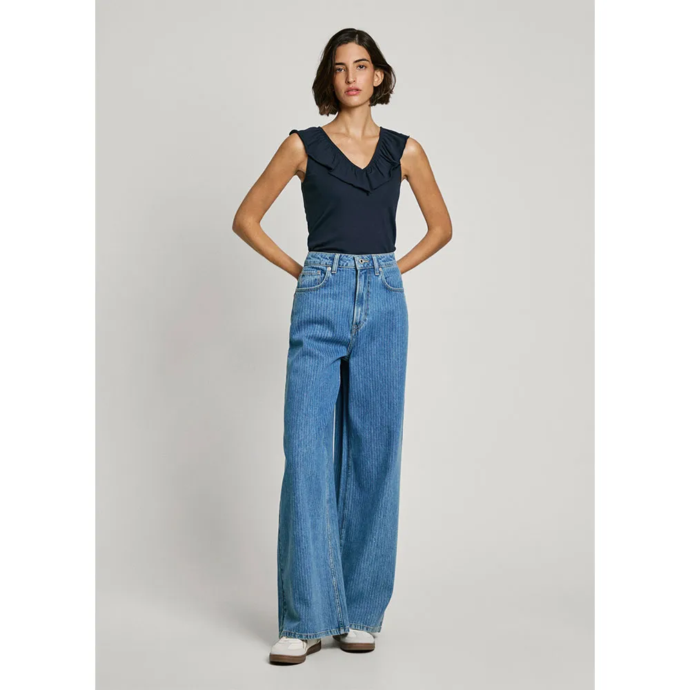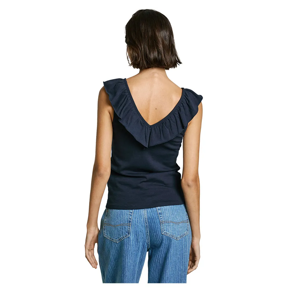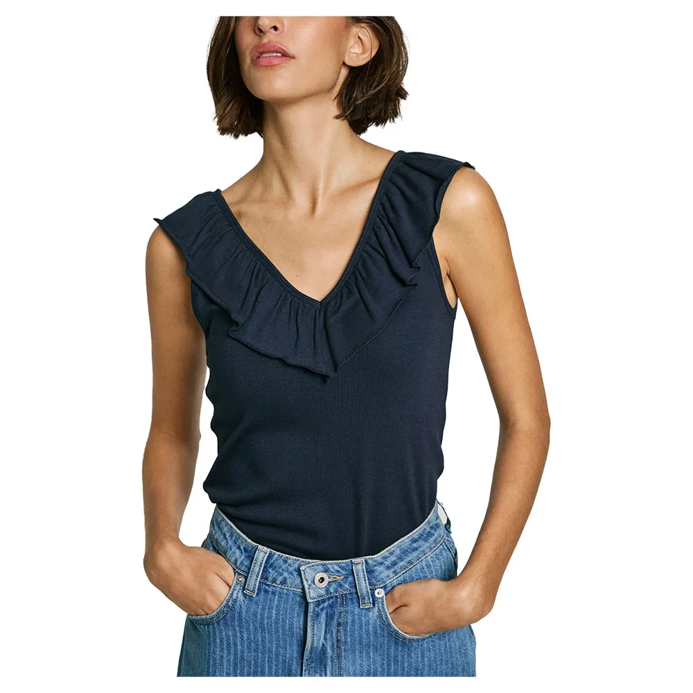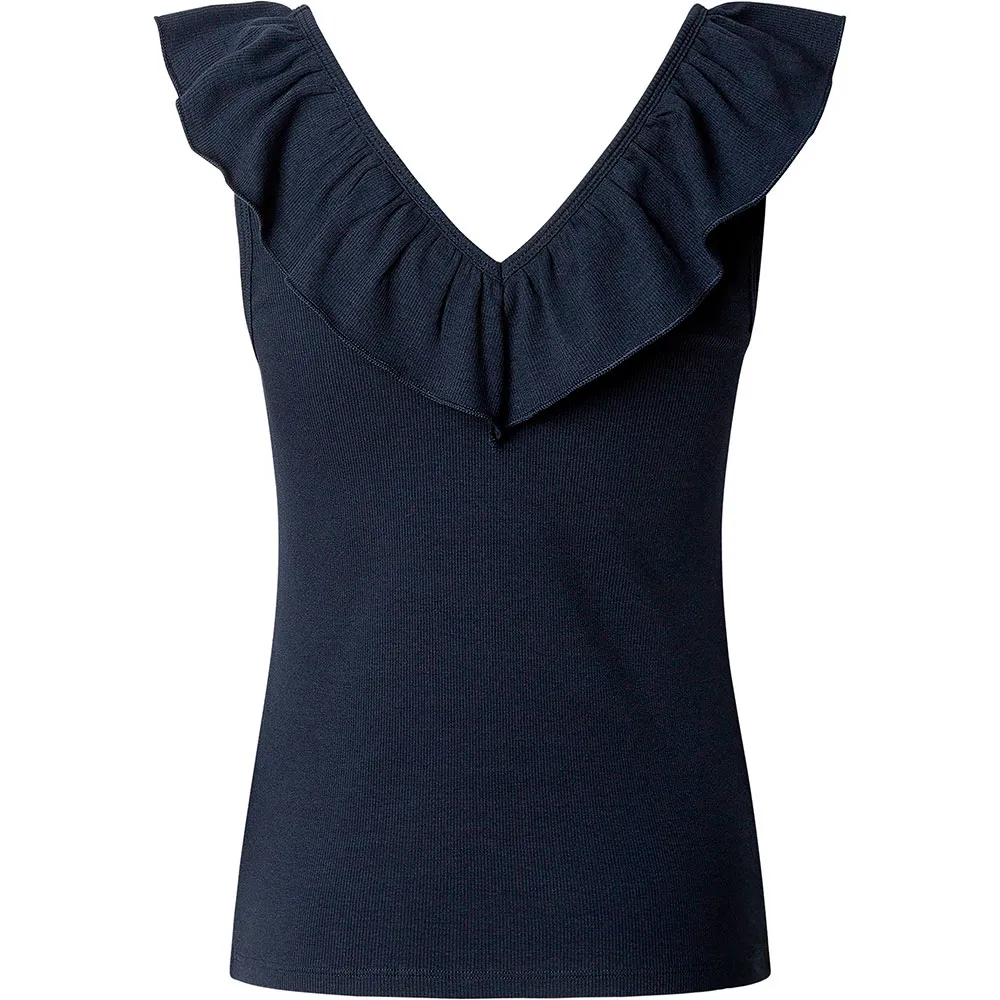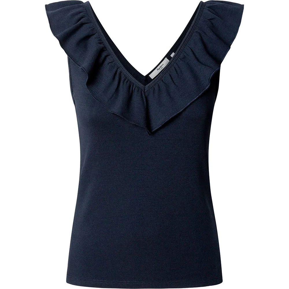 Футболка Essentials с V-образным вырезом, без рукавов, с двухслойной оборкой вокруг воротника и вышитым логотипом на подоле.