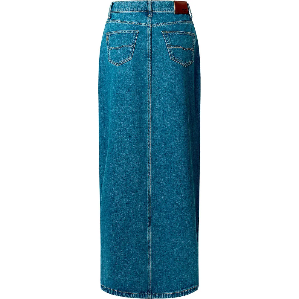 Модная макси-юбка с высокой талией, выполненная из жесткого денима средне-синего цвета.