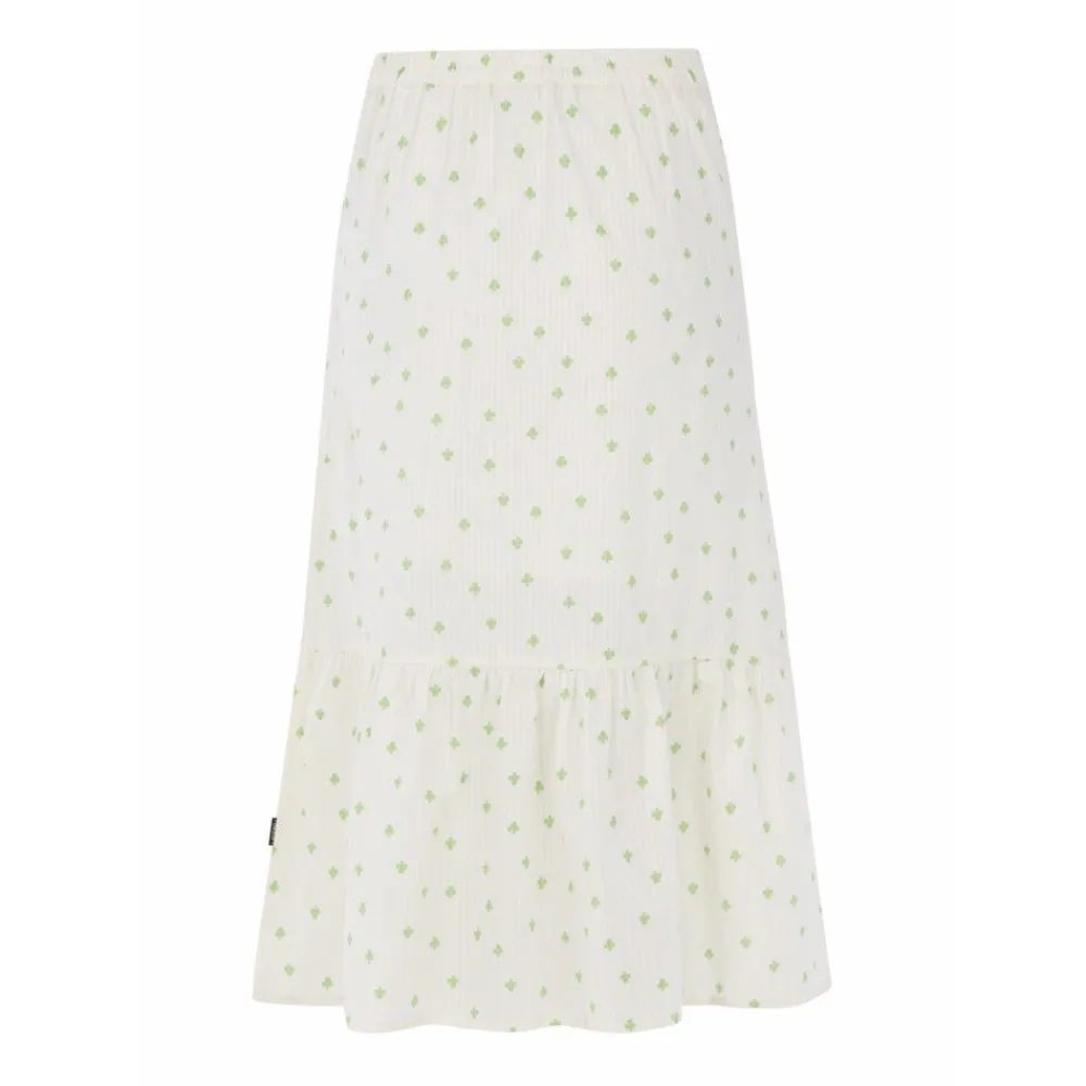 Эта красивая юбка украшена очаровательным рисунком клевера по всей поверхности на нежном полосатом фоне.