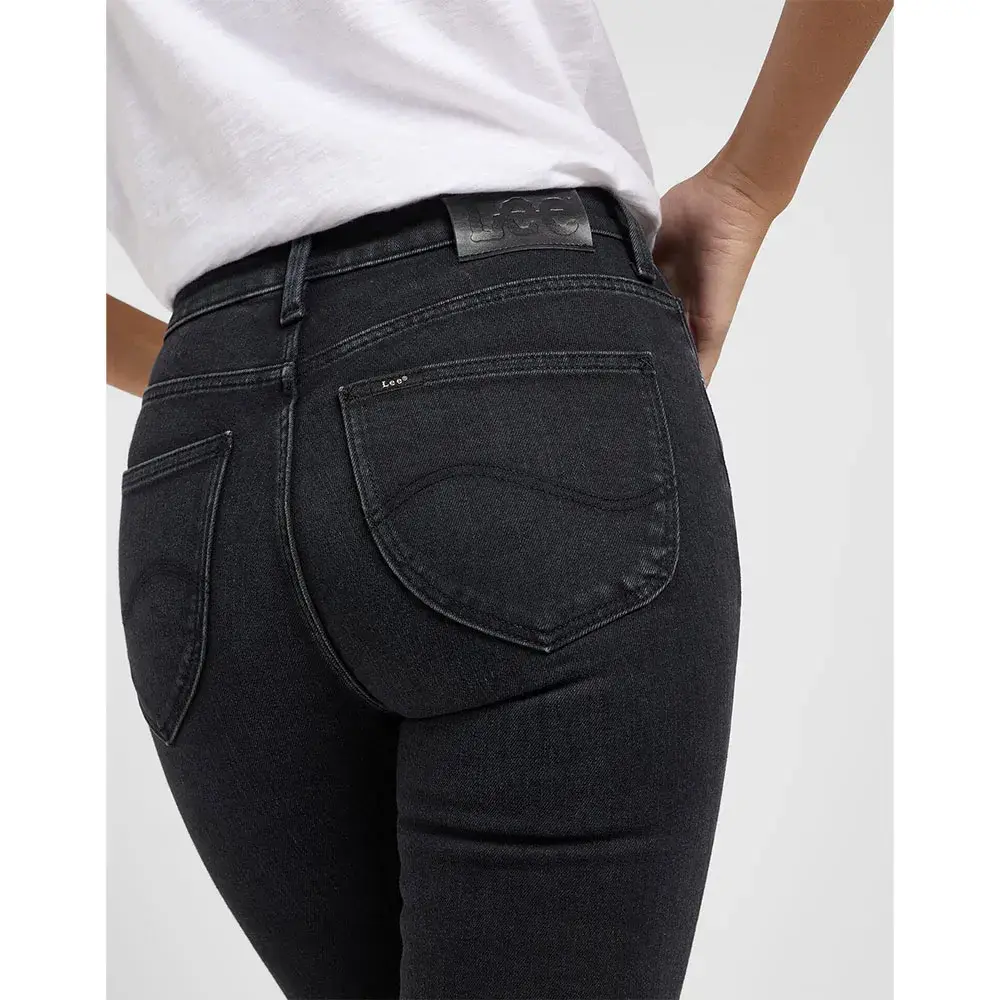 Эти джинсы имеют черную окраску с едва заметными выцветаниями на бедрах.