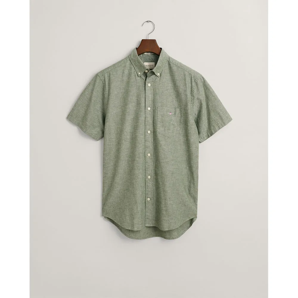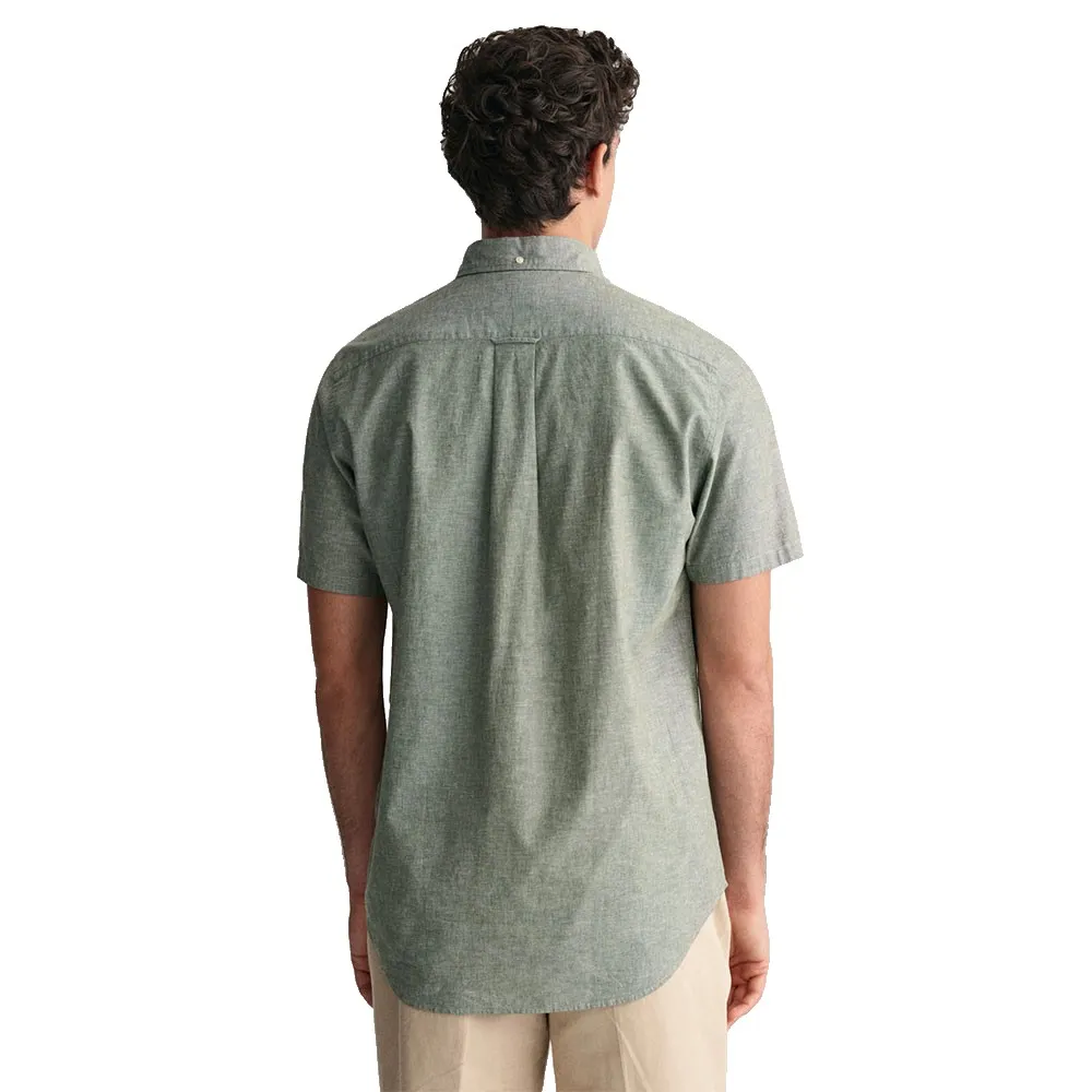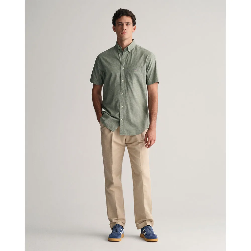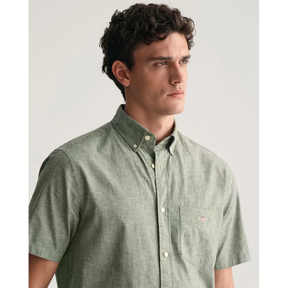 Рубашка имеет короткие рукава, воротник на пуговицах, закругленный подол, нагрудный карман, украшенный вышивкой щита GANT, и практичную складку с петлей для крепления на спине.