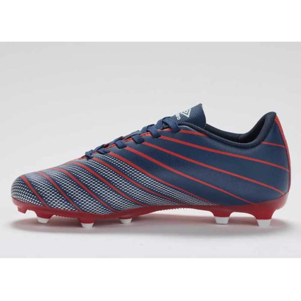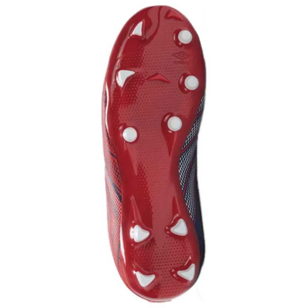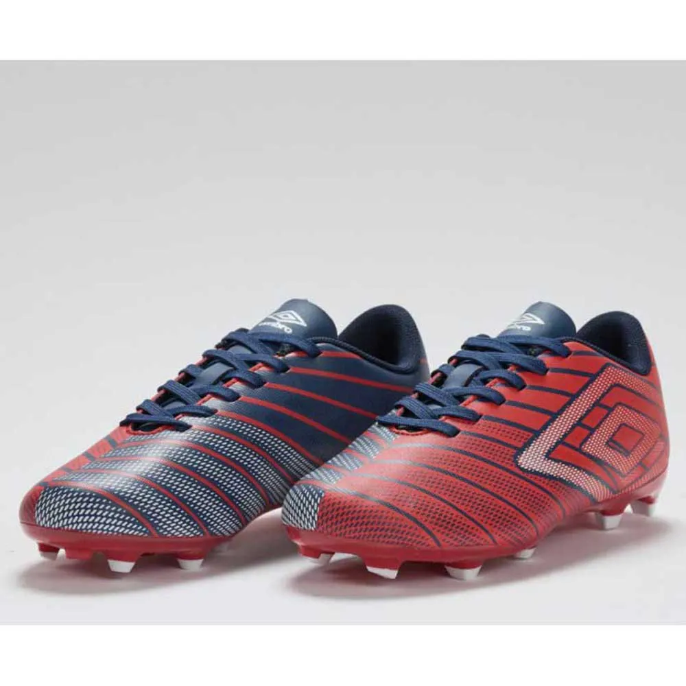 Футбольные бутсы UMBRO Velocita Elixir League FG в цветах Rococco Red/White/Estate Blue — стильный и высокопроизводительный вариант для юных футболистов. Эти бутсы разработаны для игры на твердых покрытиях, что делает их универсальными и подходящими для различных игровых условий.