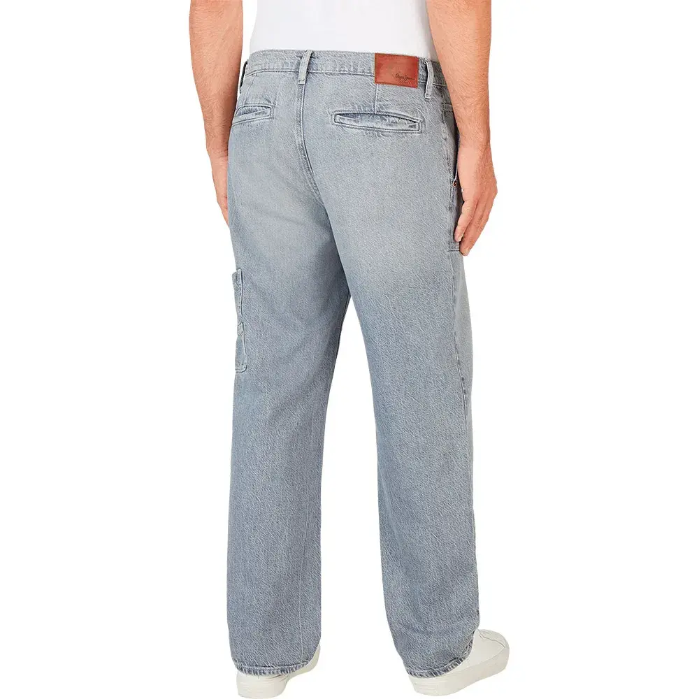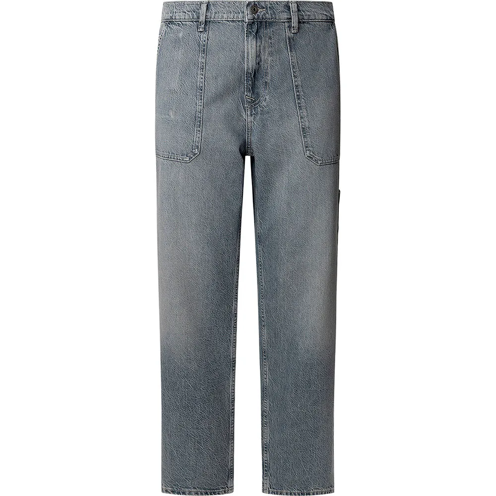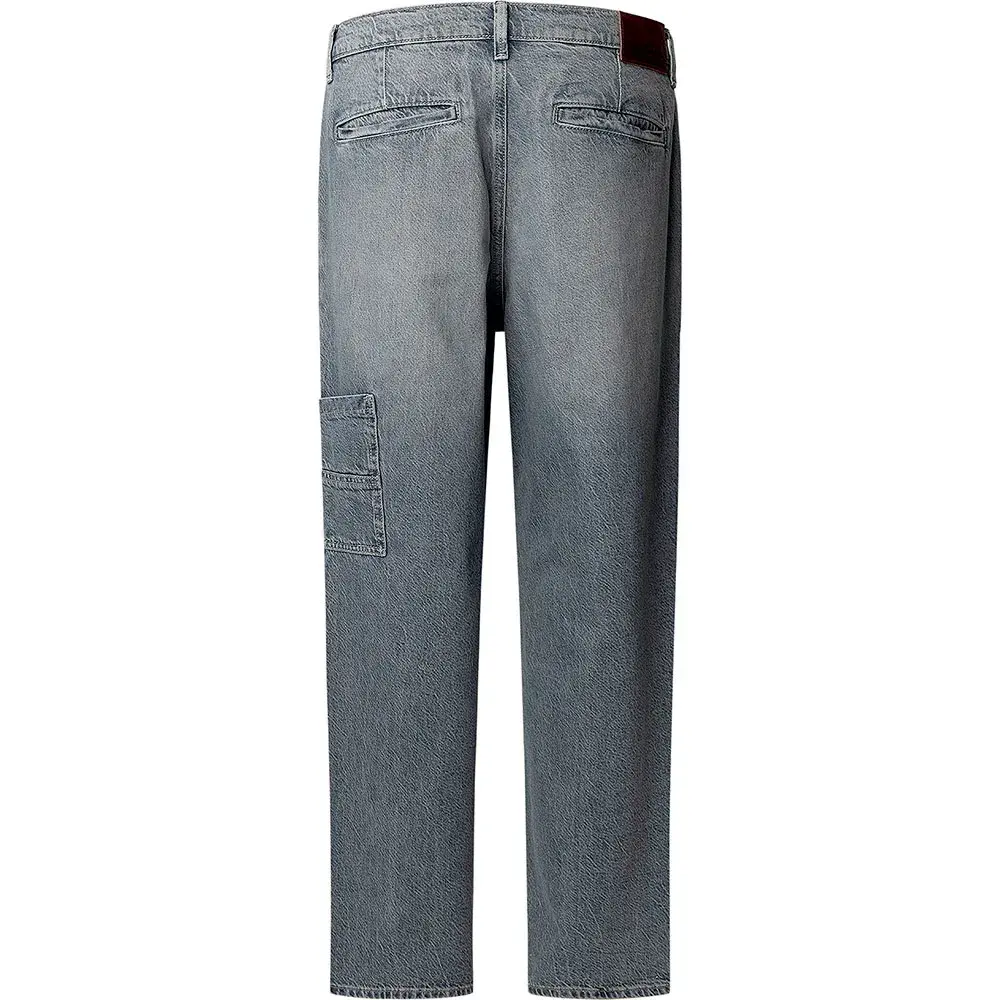 Современный свободный крой с прямыми штанинами и накладными карманами, выполненный из классического серого денима с легким эффектом потертости.