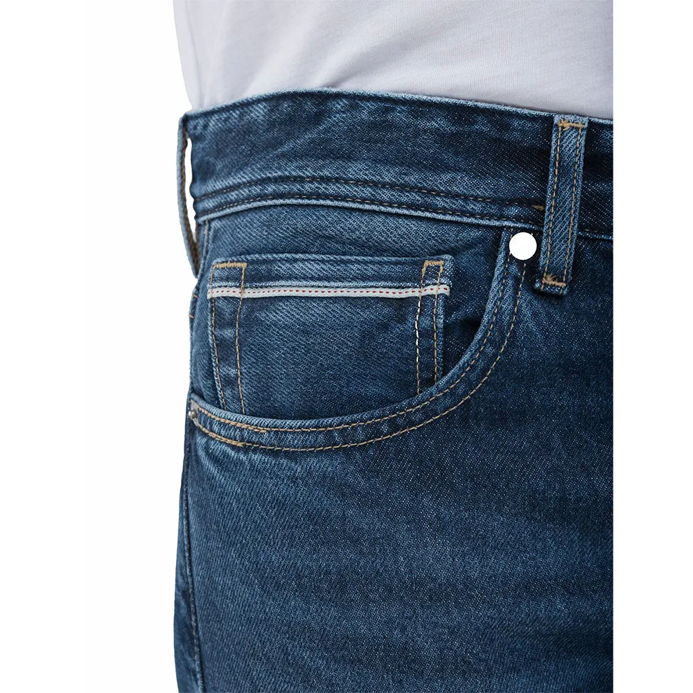 Джинсы прямого кроя с обычной талией и прямыми брючинами для комфортной посадки. Изделие изготовлено из эластичного хлопкового денима цвета индиго плотностью 11 унций со средней степенью стирки Stonewashed. Модель с пятью карманами обработана ферментом, что создает контрастные цвета на изношенных участках. Брюки застегиваются на пуговицы.