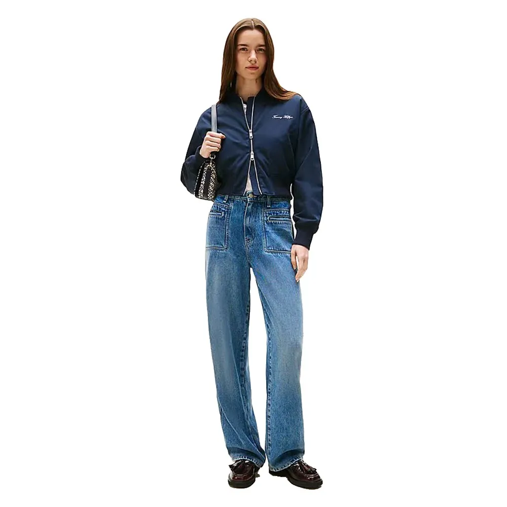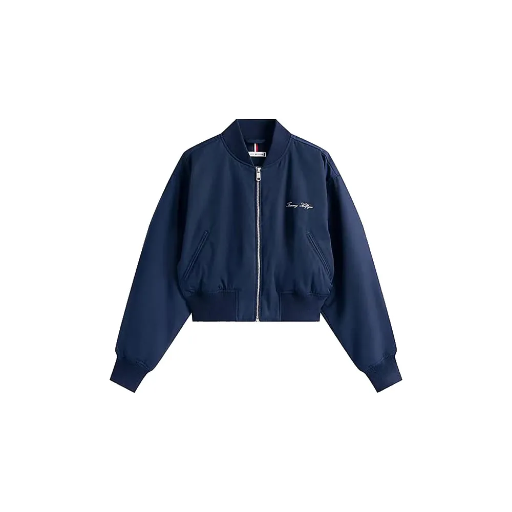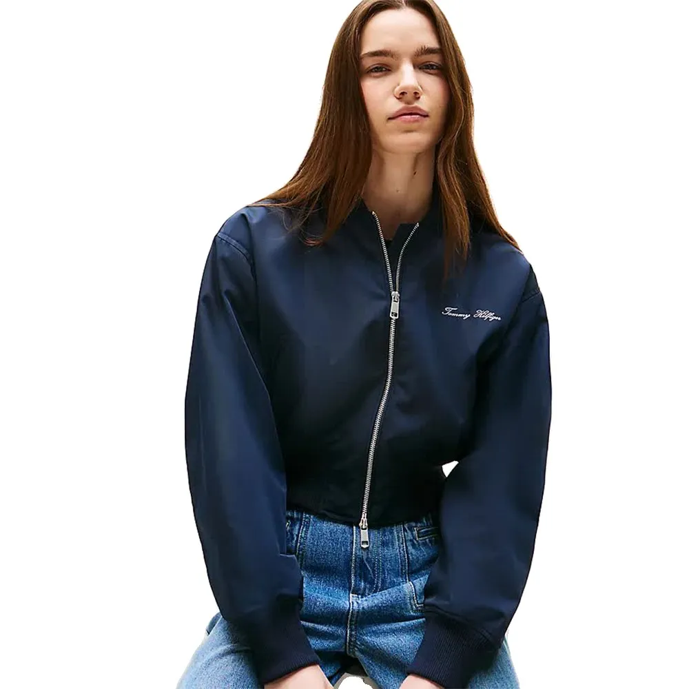 Укороченная нейлоновая куртка-бомбер с металлической молнией спереди и вышитым на груди курсивным логотипом.