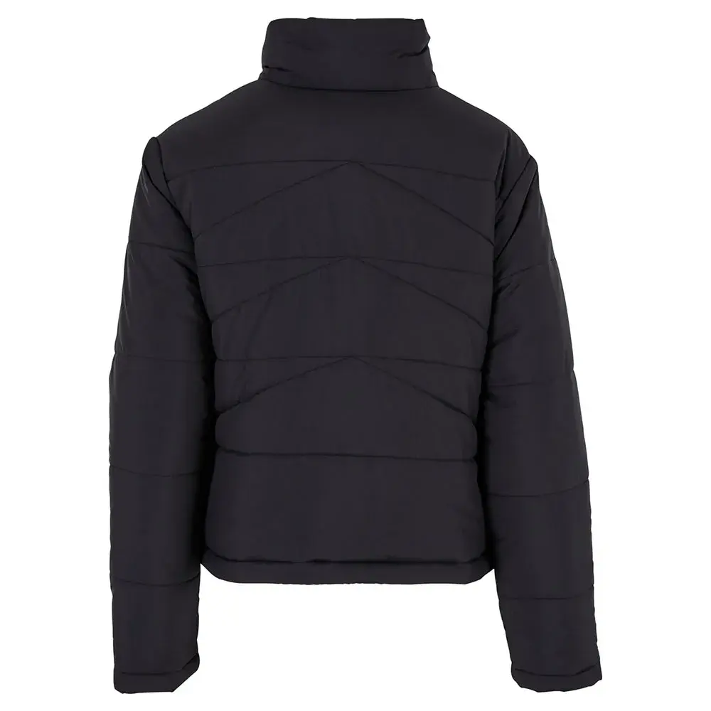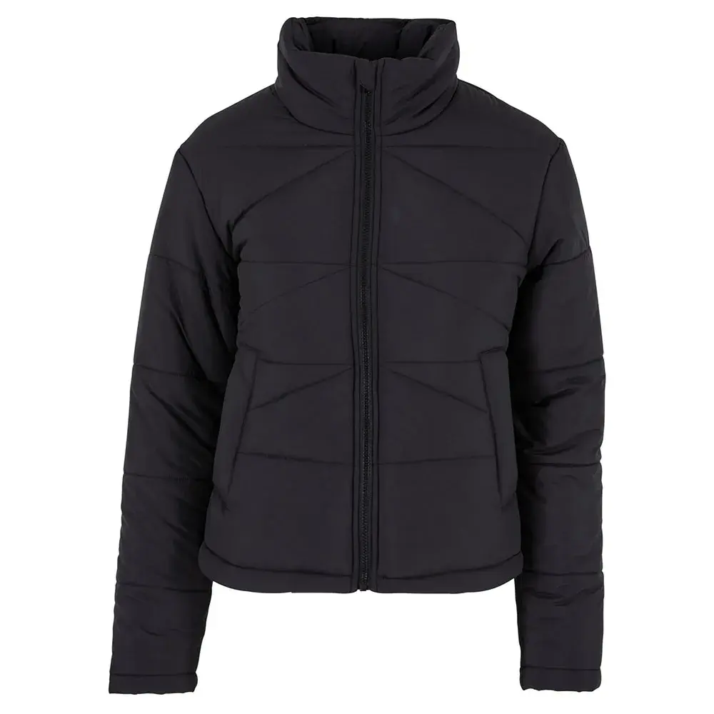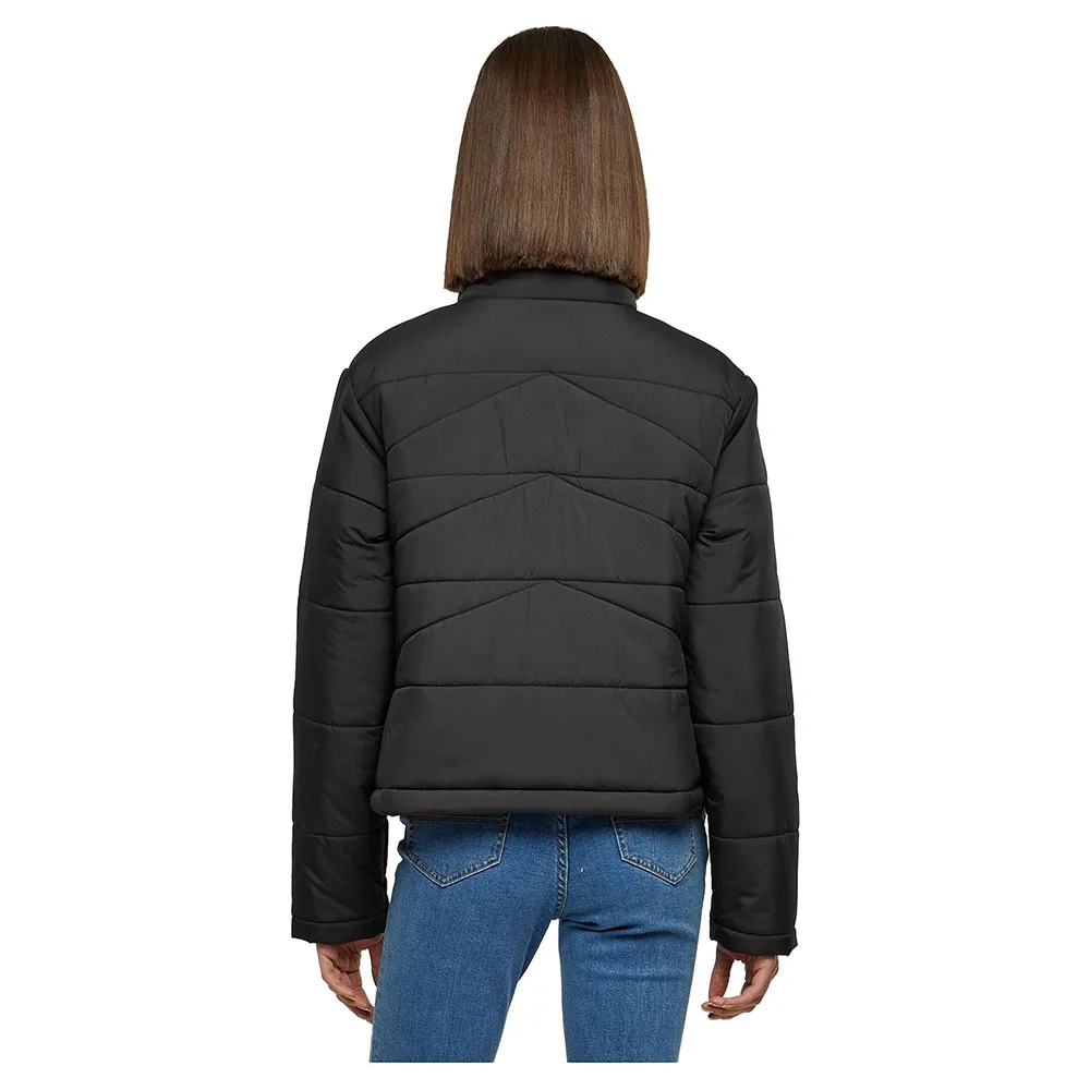 Женская стеганая куртка впечатляет своим спортивным, коротким кроем и изящными деталями. Она искусно простегана в форме стрелы и утеплена. Она также имеет высокий воротник-стойку, боковые карманы и подол со шнурком. Стеганая куртка застегивается на молнию. Подкладка также стеганая. Женская куртка имеет удобный свободный крой.
