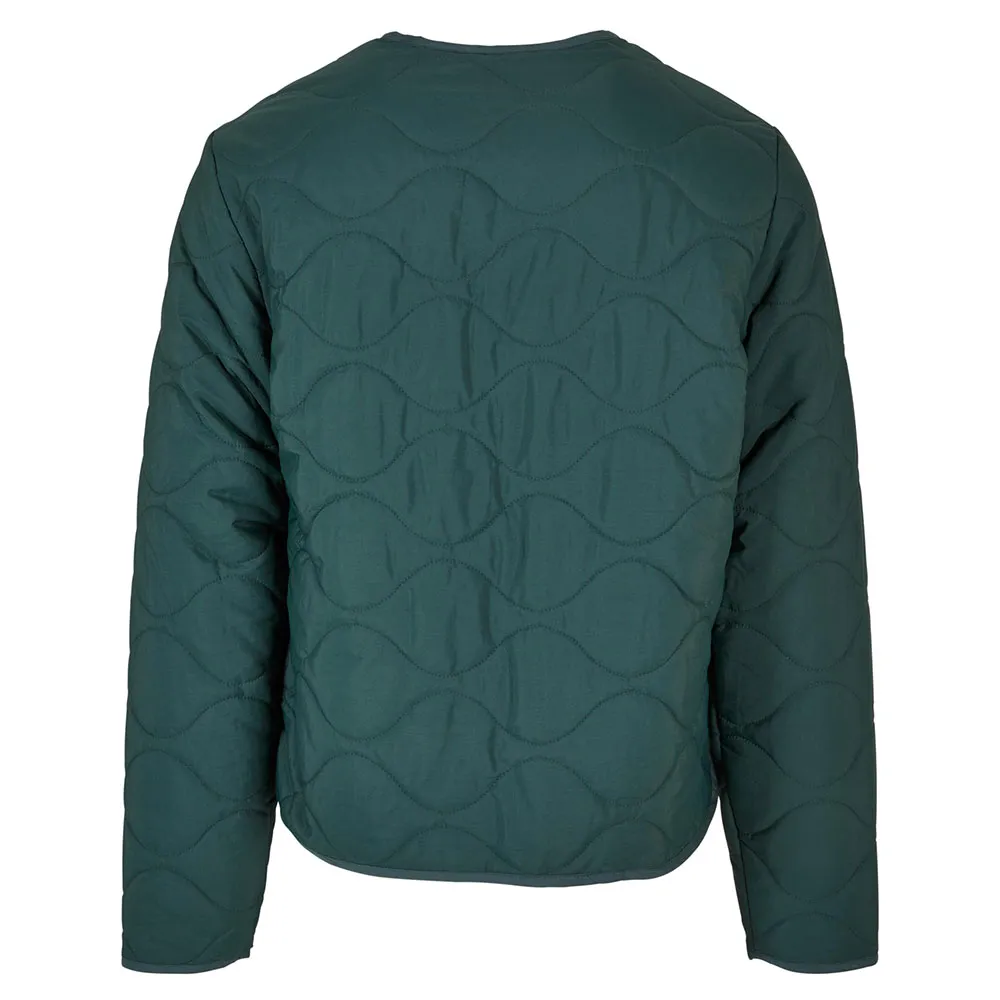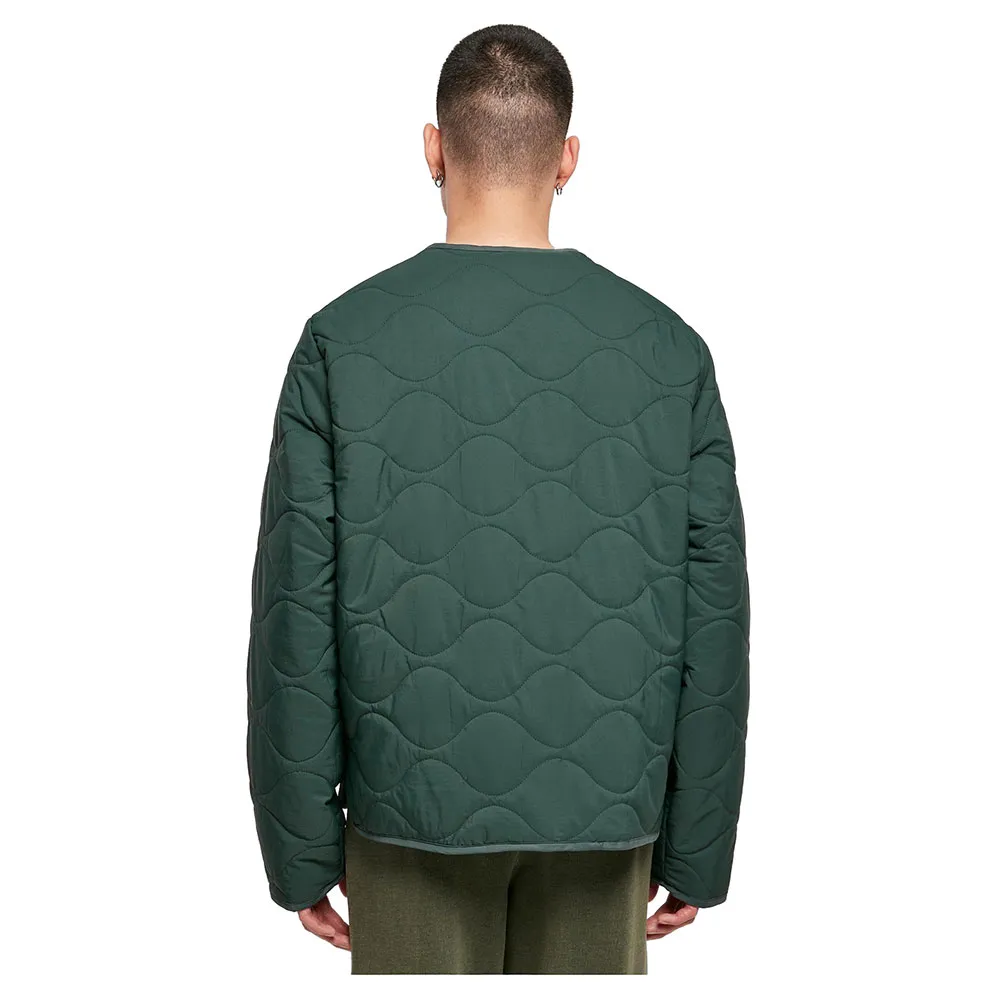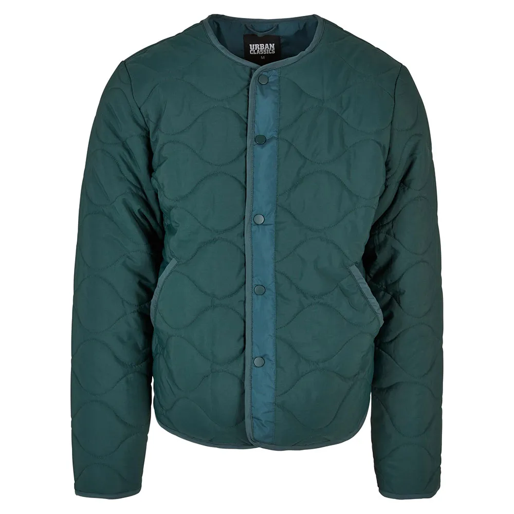 Мужская стеганая куртка проста в пошиве. Три использованных материала придают ей объёмный вид. Она имеет два боковых кармана и один внутренний, воротник отсутствует, а застёгивается на металлическую кнопку. Мужская куртка имеет стандартный крой и изготовлена из полиэстера с подкладкой из тафты.
