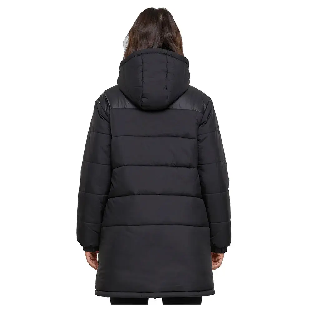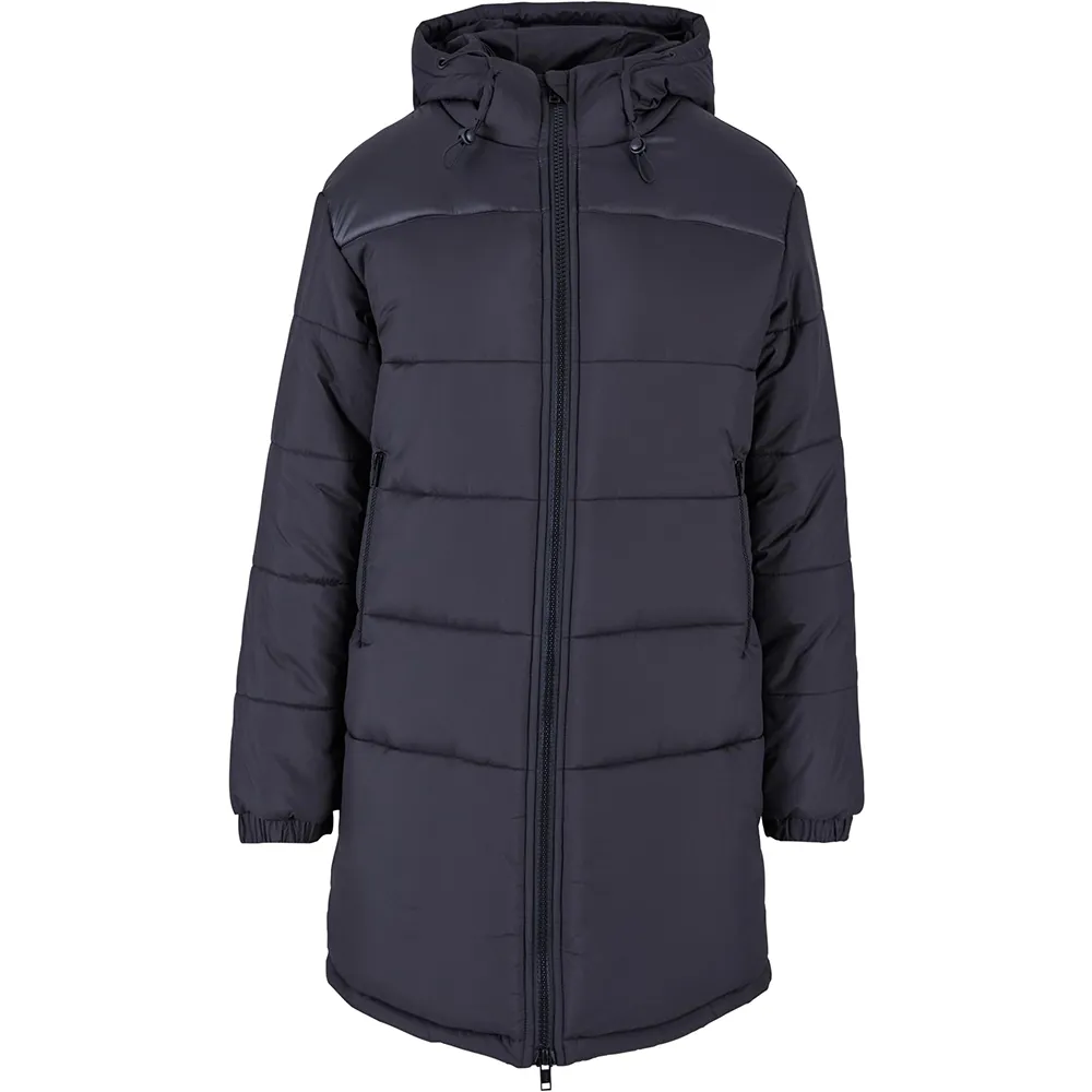 Длинная женская стеганая куртка - универсальный и успешный предмет моды с прочной теплой подкладкой и блестящей кокеткой в области плеч. Она имеет большой капюшон, который можно индивидуально отрегулировать с помощью шнурка и стопора. Два боковых кармана на молнии практичны. Стильный крой благодаря свободному крою и спущенным плечам. Женская куртка застегивается на молнию с защитой подбородка. Концы рукавов эластичные. Стеганая куртка изготовлена из прочного полиэстера и подбита тонкой тафтой.