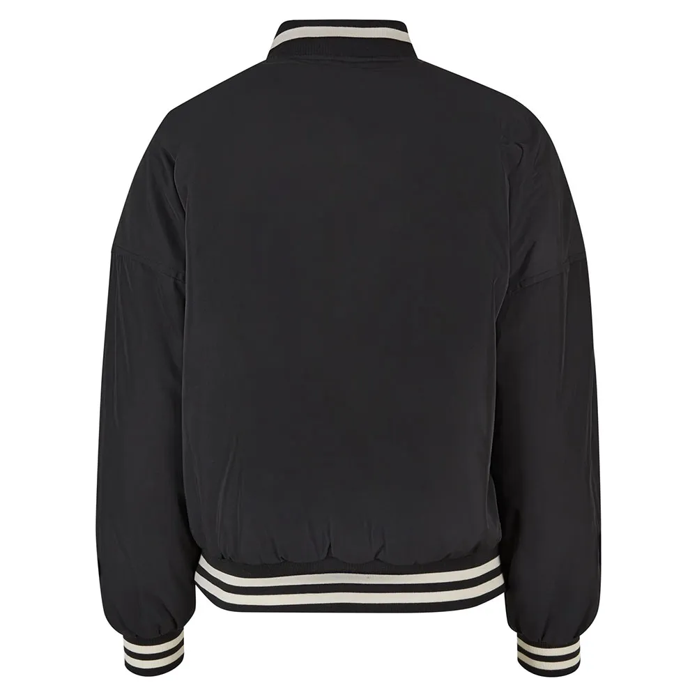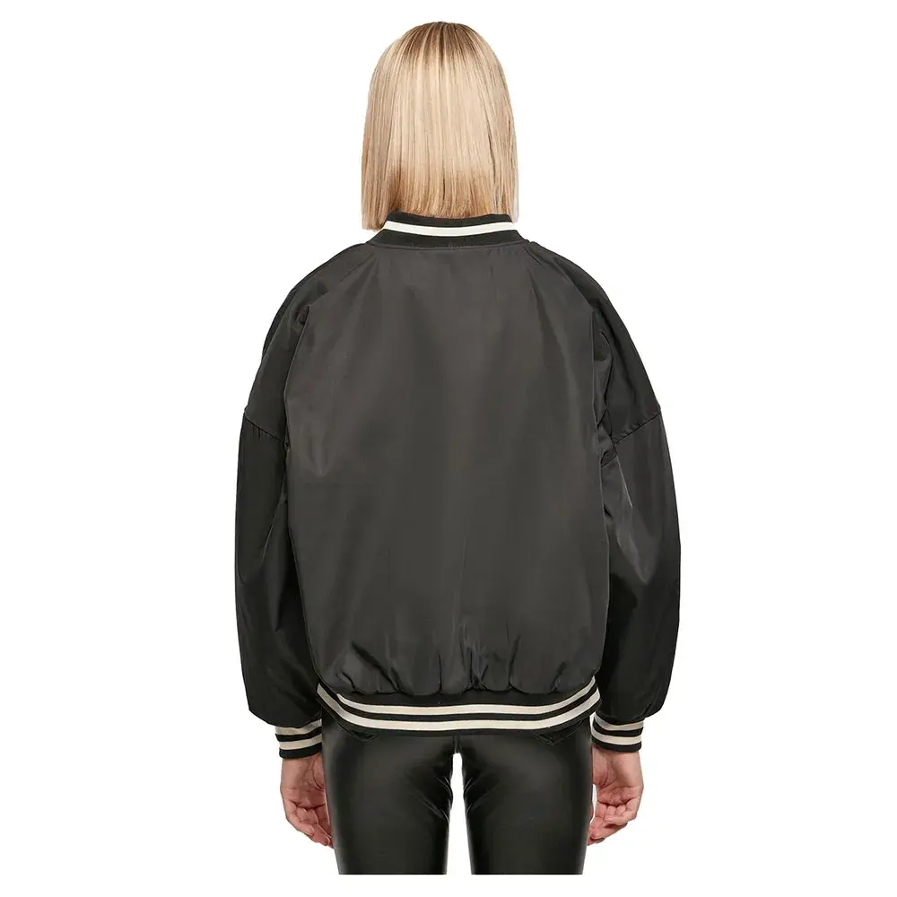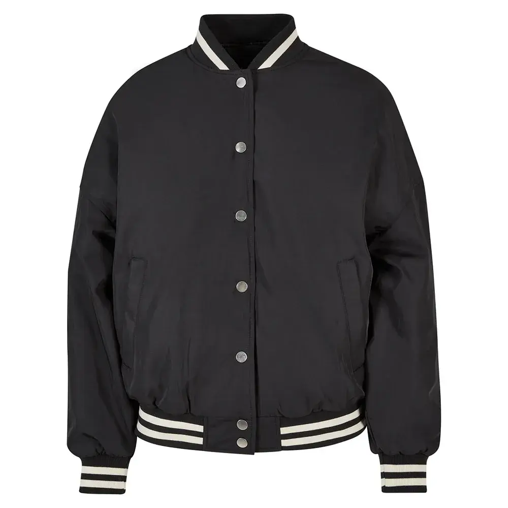 Женская студенческая куртка выполнена в традиционном стиле, дополненном свободным кроем с широкими спущенными плечами и тканью из экологически чистого переработанного полиэстера. Куртка имеет легкую подкладку, застежку на кнопки и два боковых кармана на молнии. Воротник-стойка и широкие ребристые манжеты на рукавах и подоле украшены классическим узором в стиле студенческих полос.